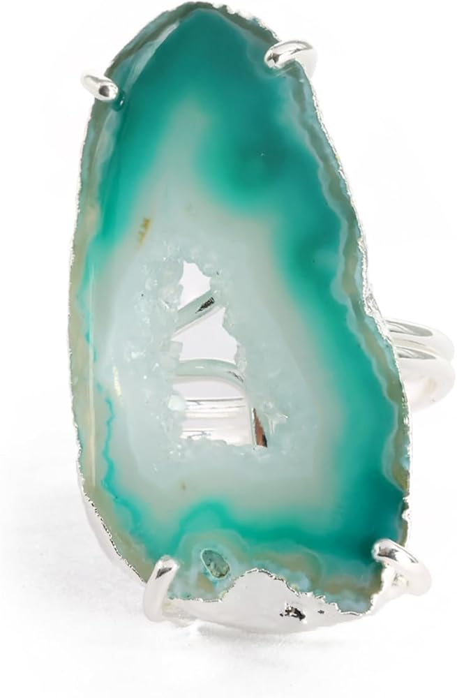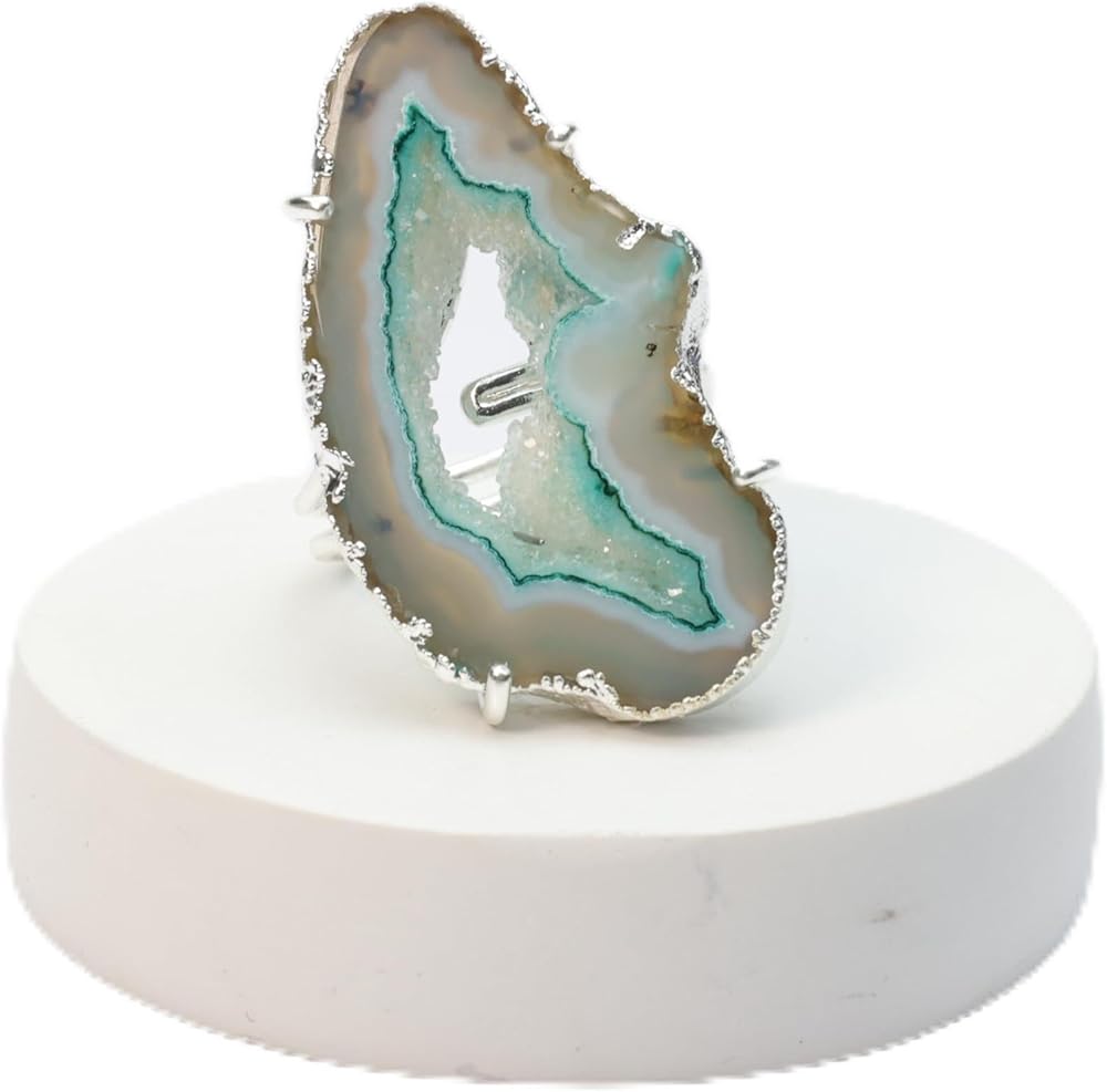 Versatile Design: The natural agate geode slice and druzy multicolor add a touch of elegance and sophistication to any outfit, whether it's casual or formal. The ring can be worn alone or stacked with other rings for a more statement look.