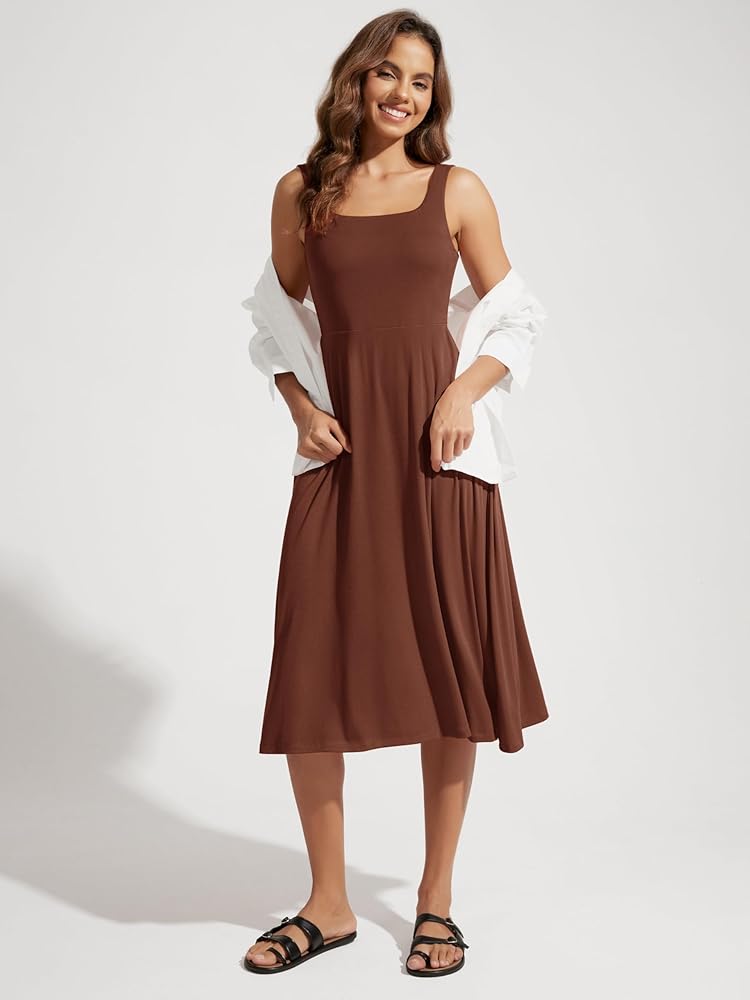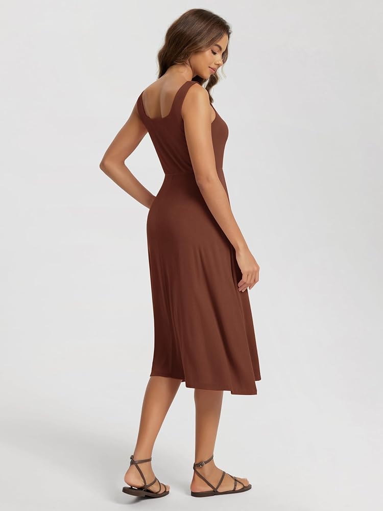 - Flare Midi Dress: Fitted through the bodice, flares out at the skirt and hits below the knee.