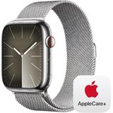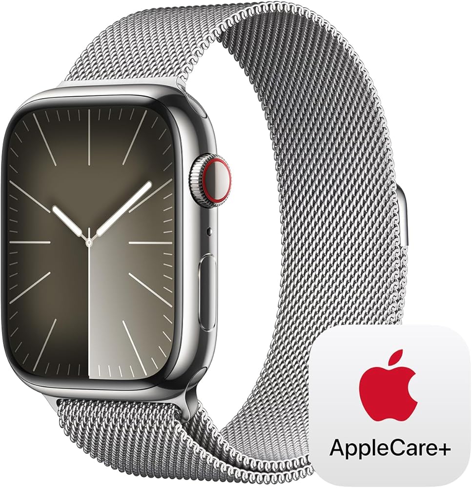 هيكل من الفولاذ المقاوم للصدأ باللون الفضي مع حزام رياضي باللون الأزرق العاصف مقاس 45 ملم + نظام تحديد المواقع العالمي (GPS) بنطاق متوسط/كبير + شبكة خلوية مع AppleCare+ (سنتان)