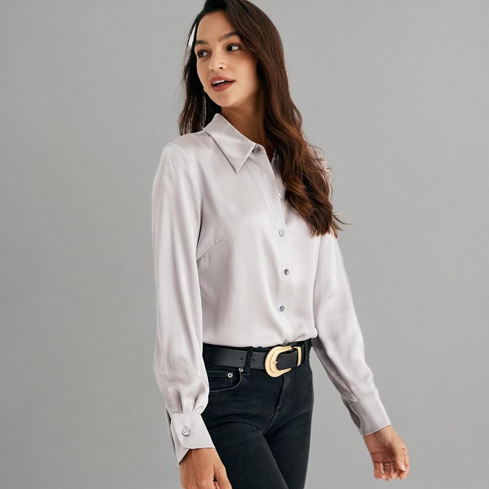 Comfortable and Soft Fabric:This classic and basic lightweight womens mulberry silk long sleeve blouse is made of 6A Grade 100% pure mulberry 19mm silk,our silk blouse for women feels smooth and luxurious against your skin and has a lustrous drape,try our versatile and casual silk blouse,this silk button down shirts for women are available in 5 sizes XS-XL,and in four colors,navy,pink,black,gray,please refer to the size information in the picture description to choose your suitable size
