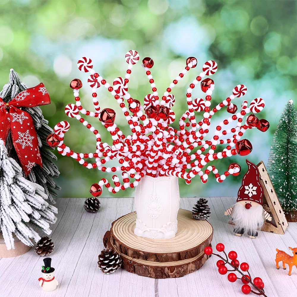 60 Pcs Candy Cane Christmas Tree Picks Decorations Red and White Bells Curly Hanging Ornaments Plastic Xmas Tree Topper Picks for Home Office Vase Crafts Party Centerpiece