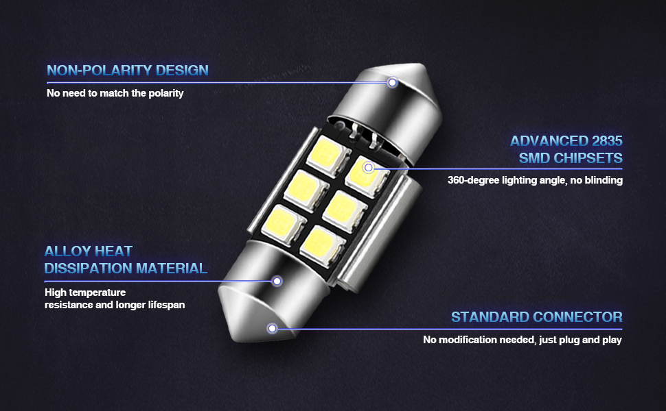 Non polarity: DE3175 31mm led bulbs is no polarity, no need to match the polarity, just plug and play, super easy to install. Built-in CANbus decoder to avoid dashboard error or flickering