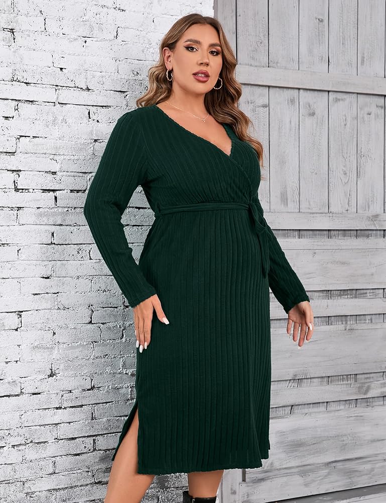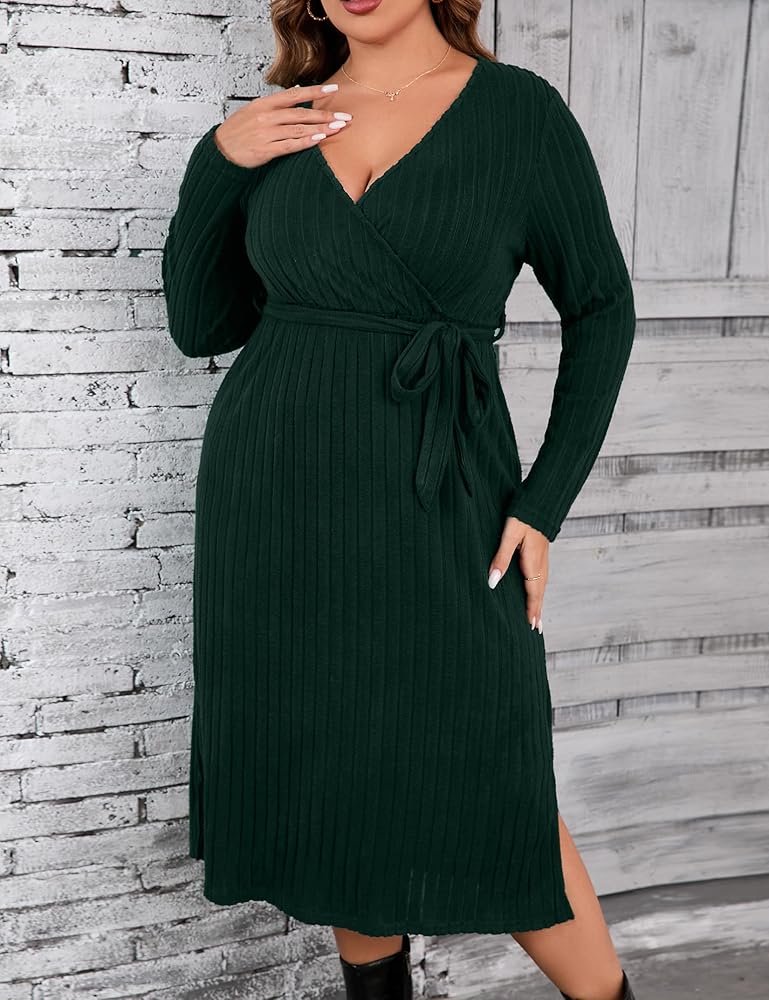 ☆DESIGN: This ribbed knitted sweater dress for plus size women features an midi length, V neck, long sleeves, and slit for a trendy style.