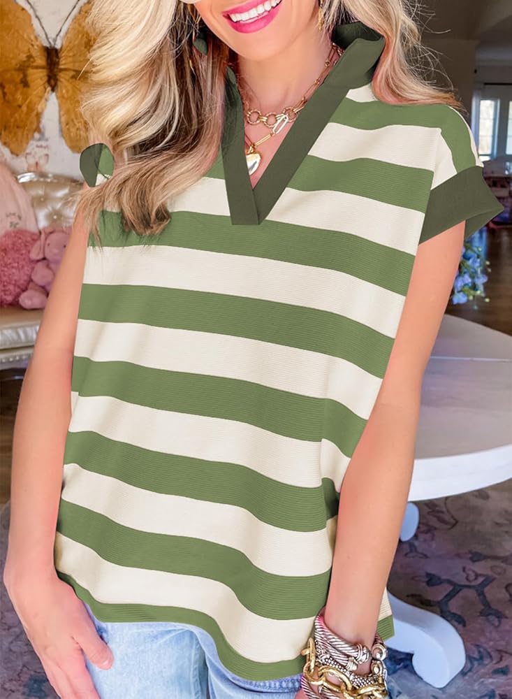 Trendy design: Color block striped tops for women trendy, drop shoulder, polo shirts, short sleeve sweatshirt for women, side slit, straight silhouette with a relaxed loose fit