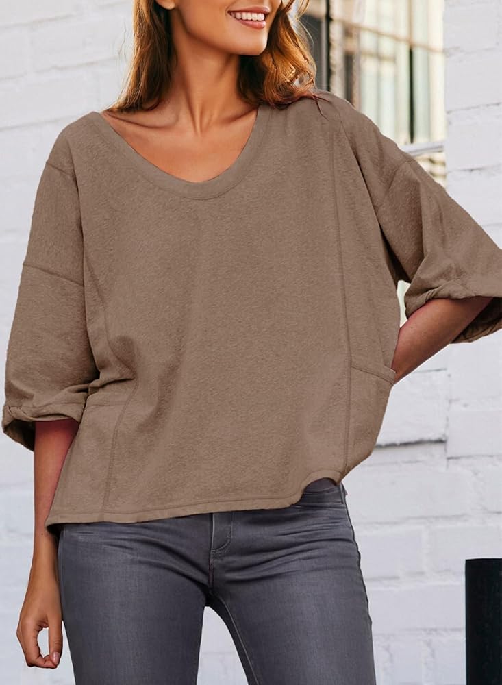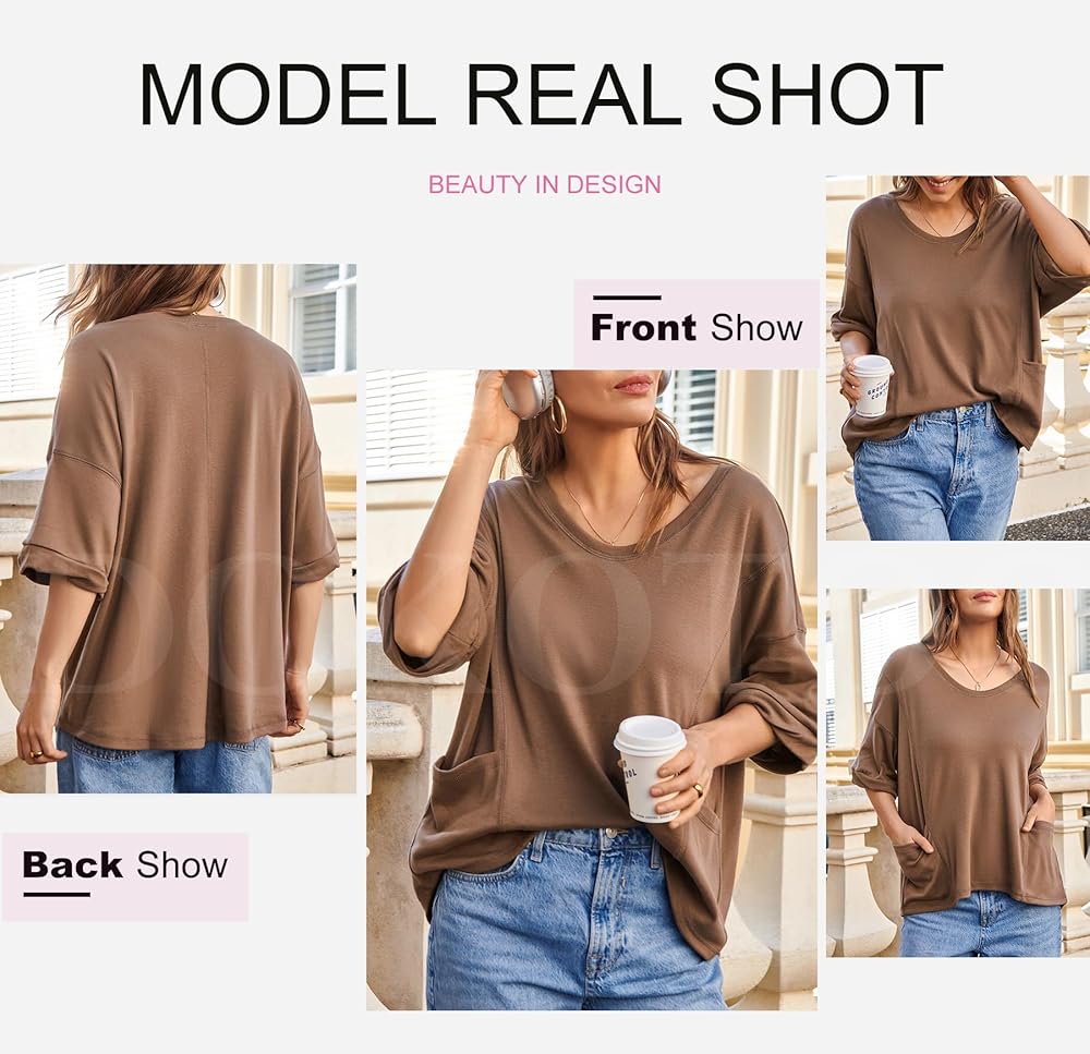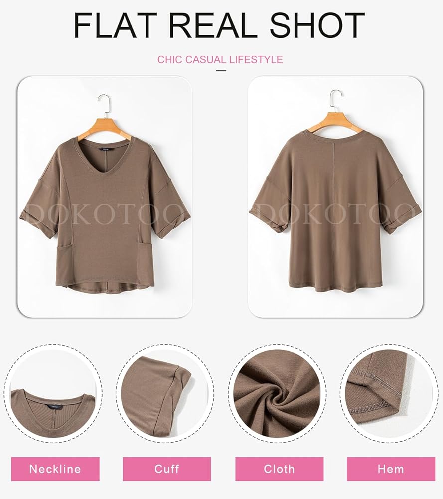 Features: Crew Neck , Short Sleeve, 3/4 Length Sleeves, Solid Color, 2 Side Pockets, Basic Design, Curved Design, Oversized Style, Relaxed Fit Tops