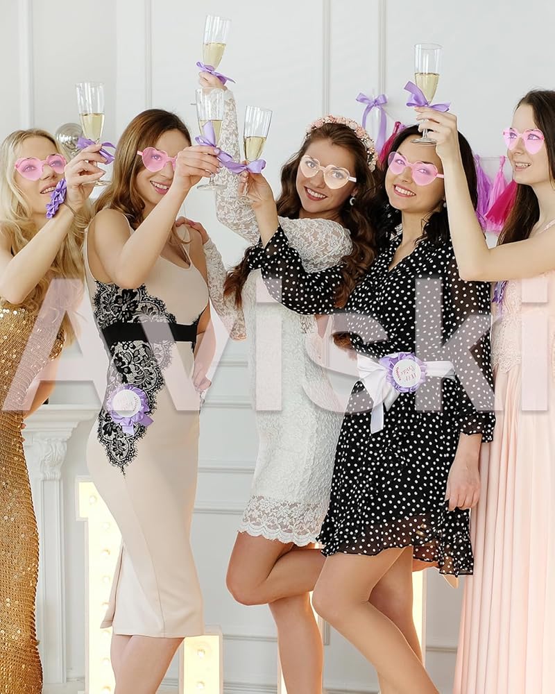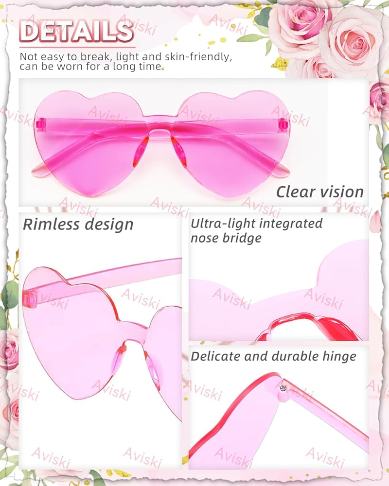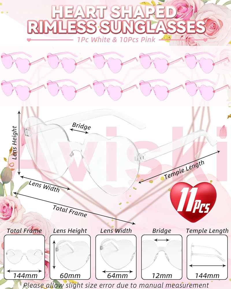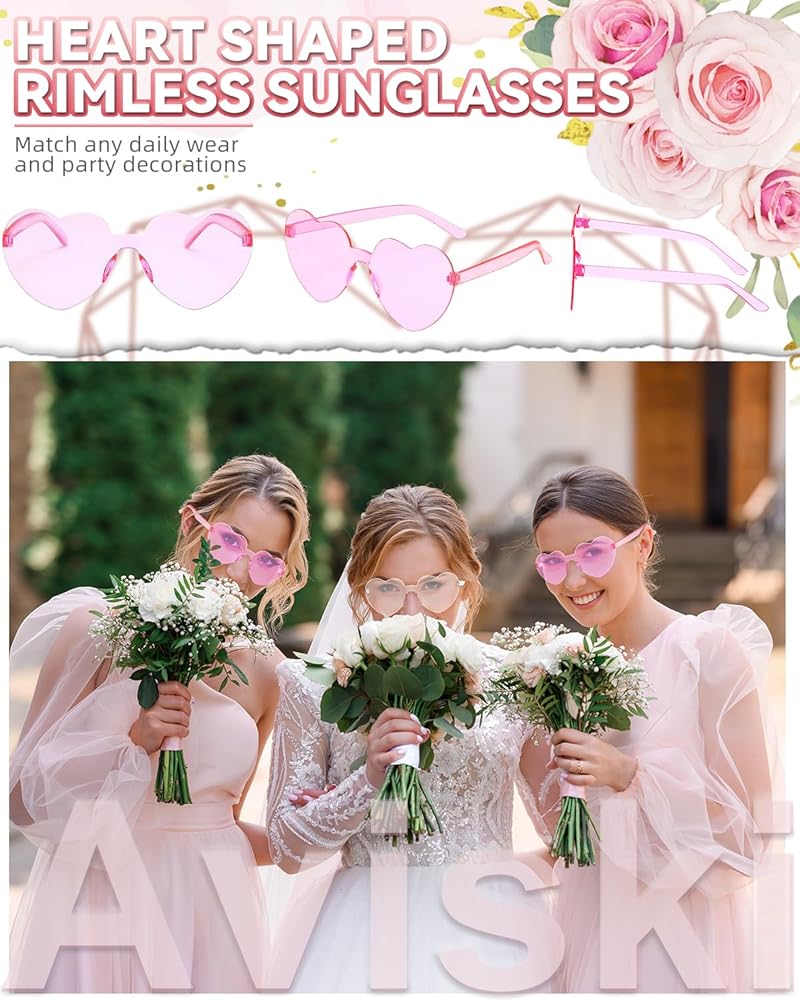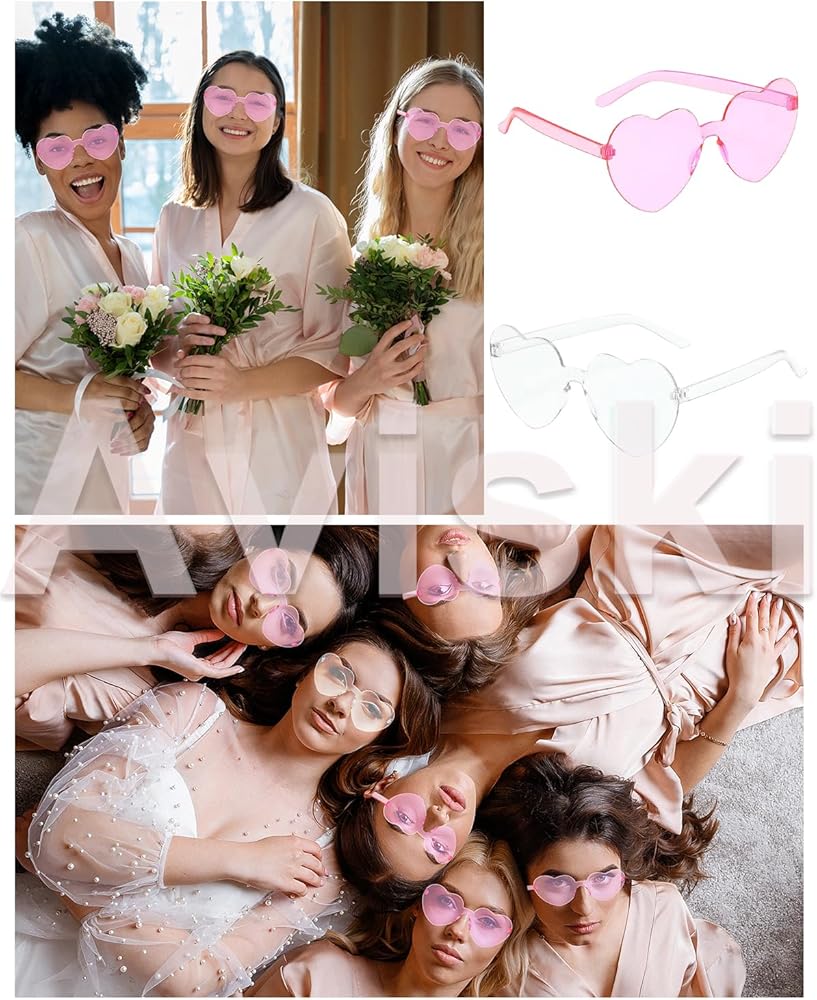 The heart shaped rimless sunglasses are designed with heart shaped rimless frame, one-piece for bride, others for team bride/bride tribe/bridemaids. You can take photos wearing these with your bridemaids/bride as photo booth props.