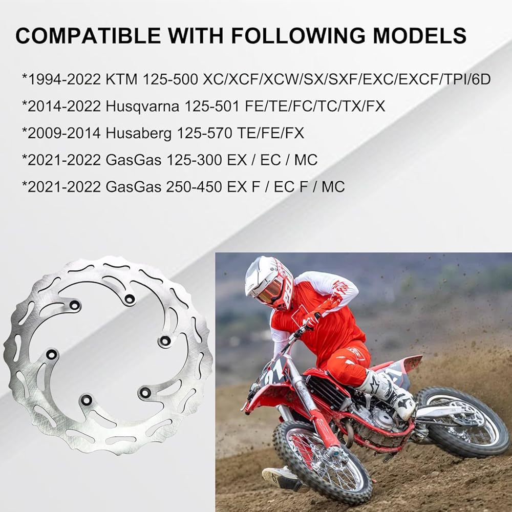 The Rear Brake Disc Rotors Compatible with 1994-2022 KTM 125-500 XC/XCF/XCW/SX/SXF/EXC/EXCF/TPI/6D, 2014-2022 Husqvarna 125-501 FE/TE/FC/TC/TX/FX, 2021-2022 GasGas 125-300 EX / EC / MC, 250-450 EX F / EC F / MC F.