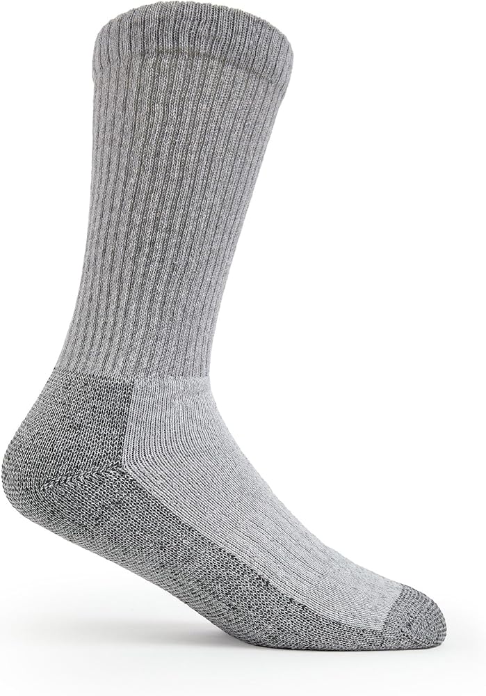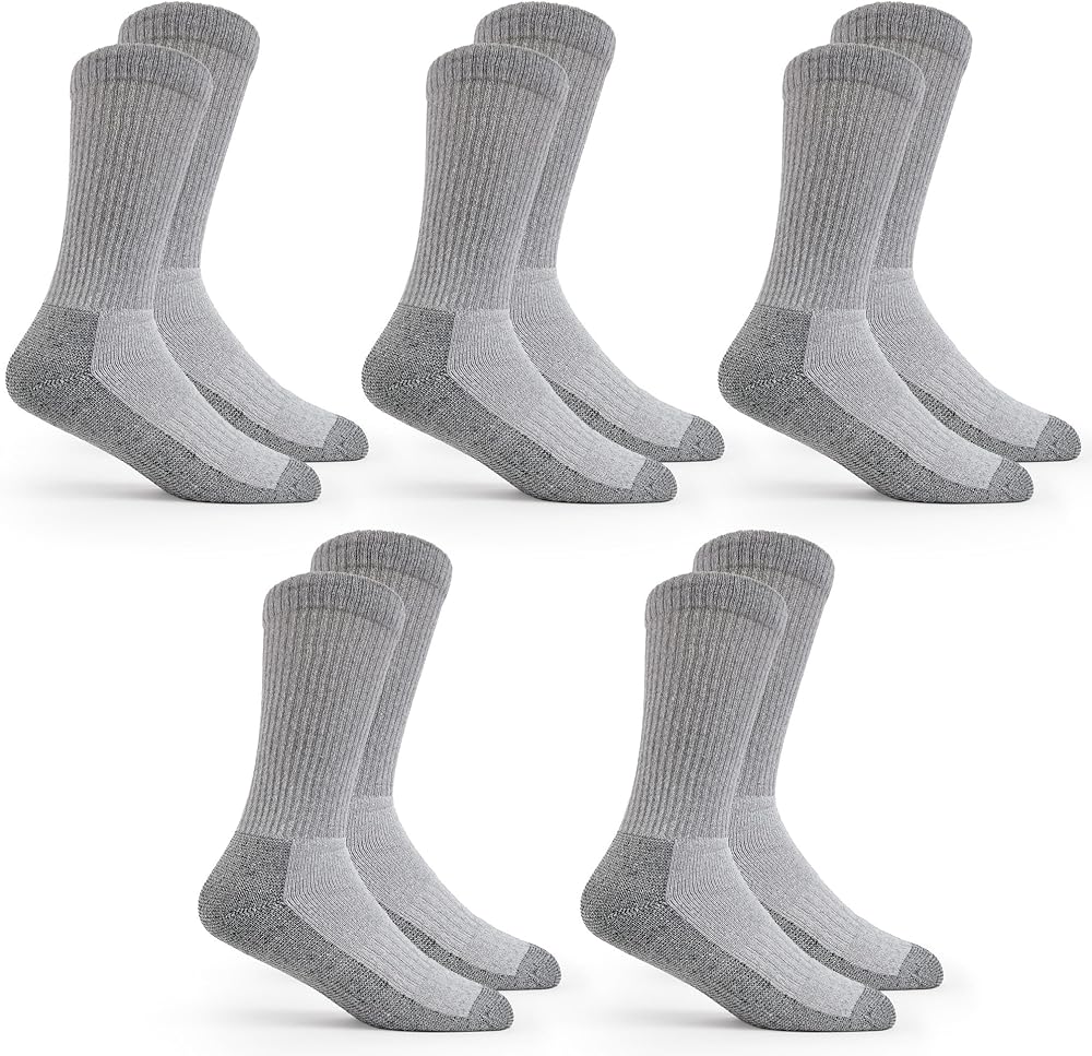 Fruit of the Loom Work Gear crew socks are designed for men who need durable and comfortable footwear for long hours on the job. These socks feature a full terry cushion footbed and built-in arch support, providing impact absorption and reducing fatigue. The reinforced heel and toe are perfect for pairing with steel-toe boots, ensuring extra durability in high-wear areas. With moisture management technology, these socks keep your feet feeling fresh and dry throughout the day. Available in a convenient 5-pack, these crew socks fit most shoe sizes from 6 to 12 (US sizing). Whether you're working on a construction site, in a warehouse, or any other demanding environment, these socks offer the support and comfort you need to power through your shift.