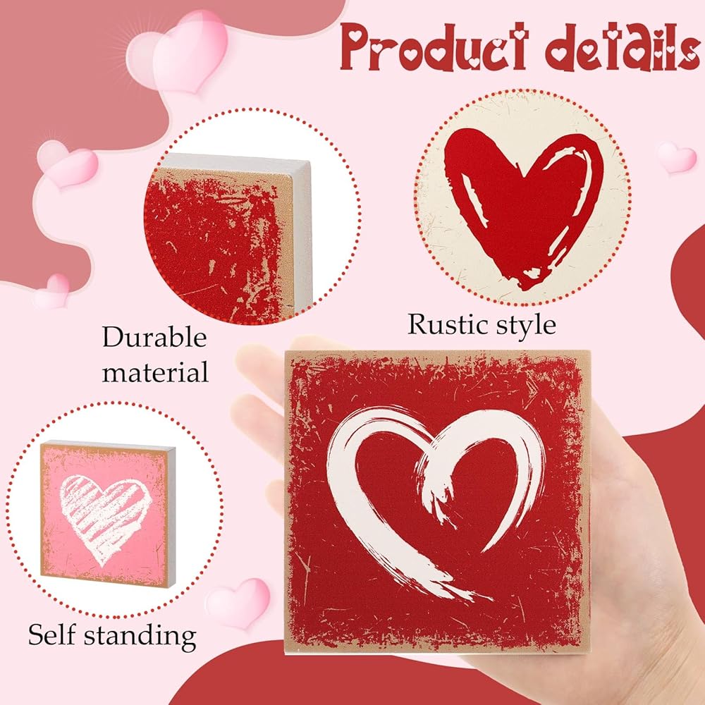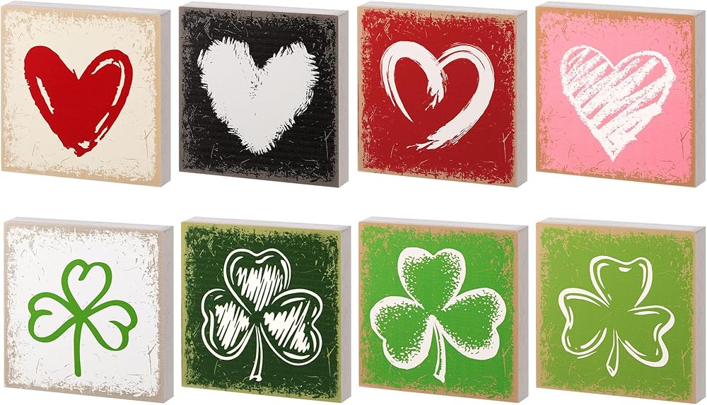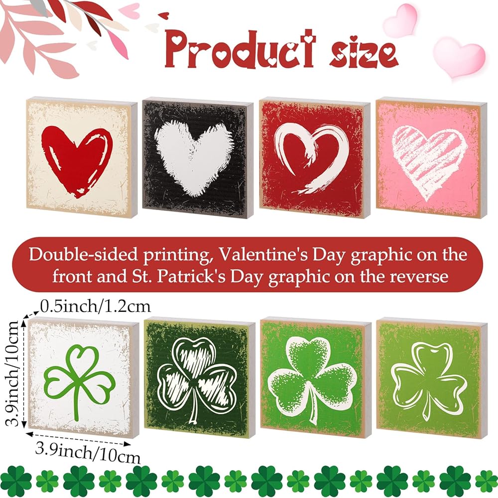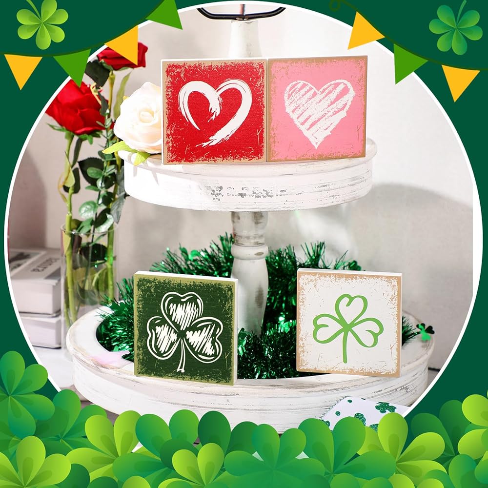 Get ready for a nice Valentine's Day and St. Patrick's Day with our wood table decor set. This package includes 4 beautifully designed wooden signs. Each sign is decorated on both sides, with a classic heart for Valentine's Day and the iconic shamrock for St. Patrick's Day.