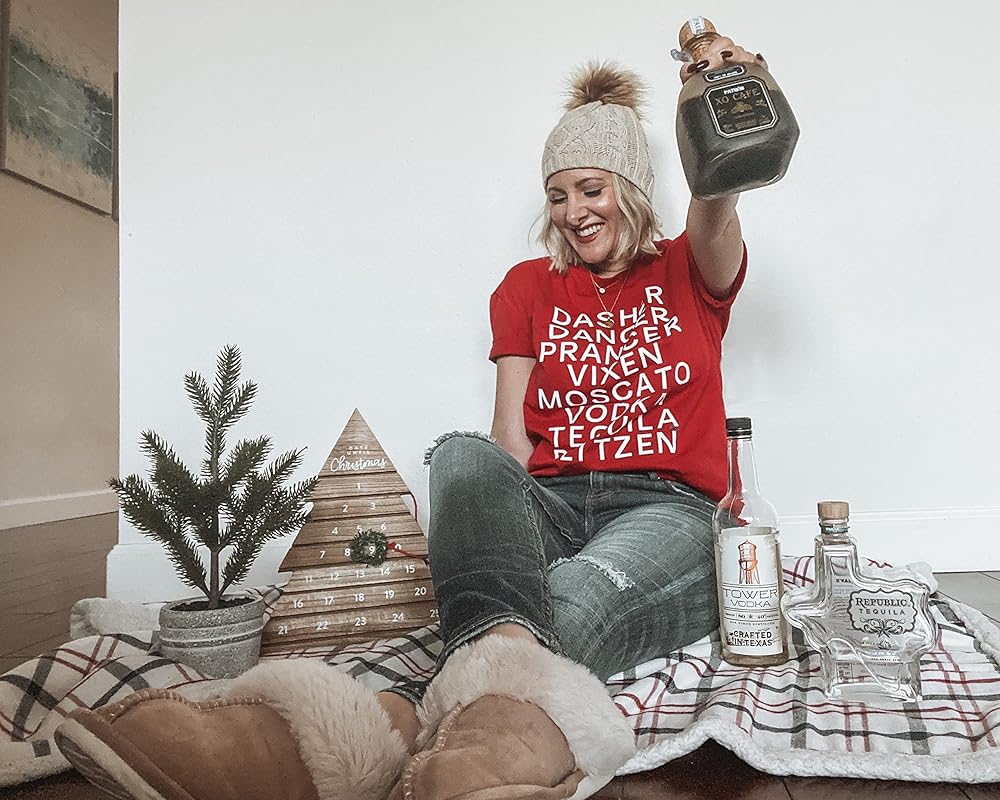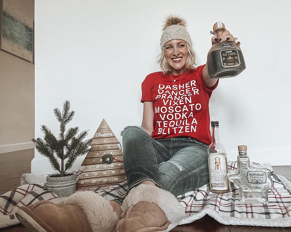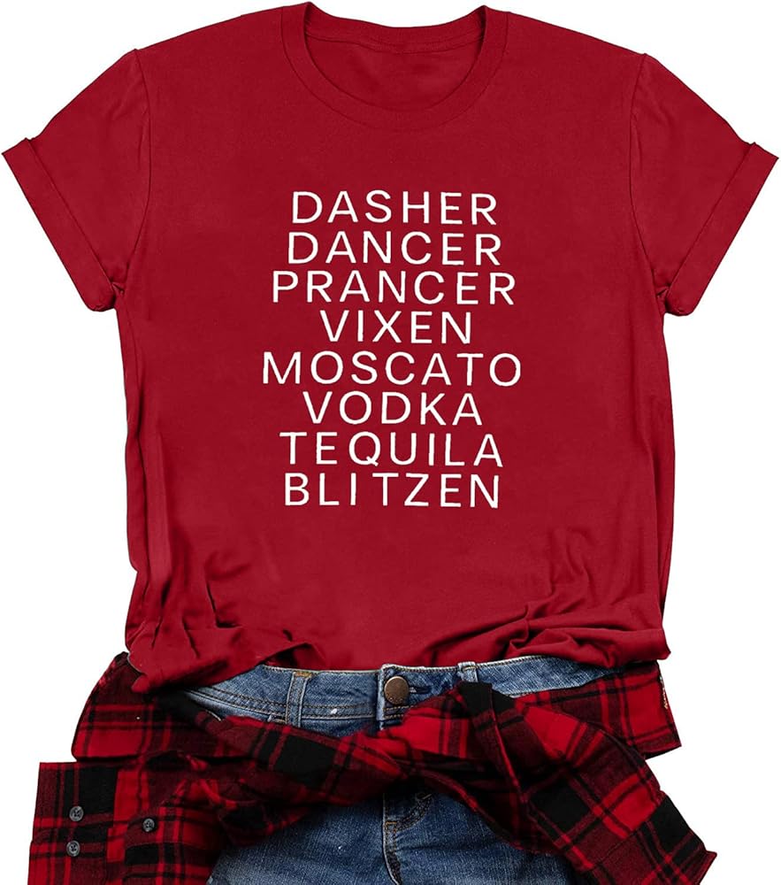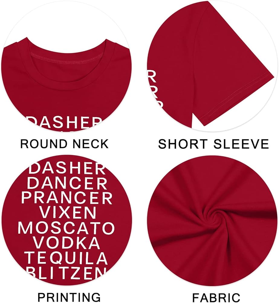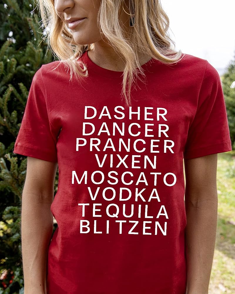 FASHION DESIGN : Dasher, dancer, prancer, vixen, moscato, vodka, tequlia blitzen. Women's Christmas atmosphere t-shirt, exquisite tailoring, simple and stylish design. We use the most advanced technology to make prints that will not fall off after washing.