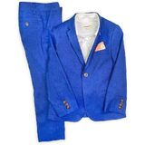 Our classic two-piece modern stretch knit suit features a notch-lapel blazer and adjustable waist and hem pants for your little one to wear as they grow! Bonus: It features an attached, contrast pocket square that can be popped out, or tucked in.