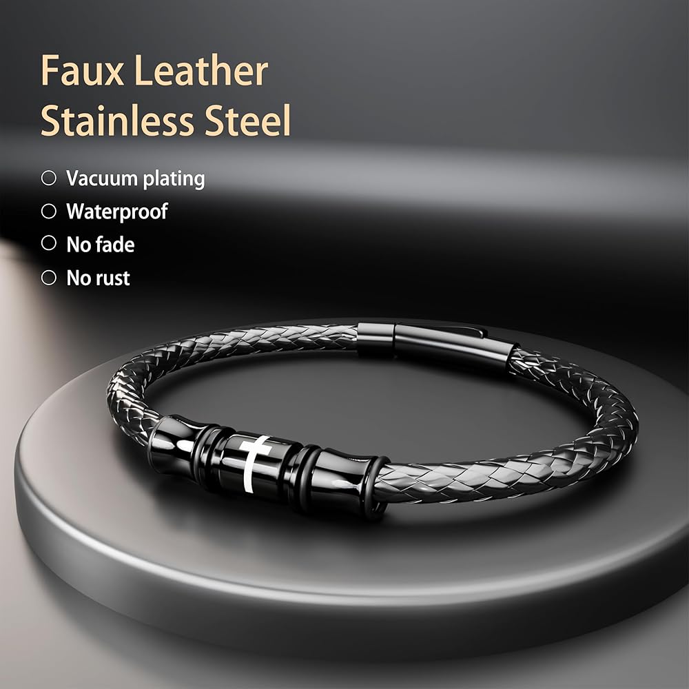 【Mens cross bracelet】We choose high quality braided leather and 316L stainless steel accessories, strong and durable, no smell, lead and nickel free, hypoallergenic and healthy.