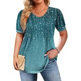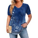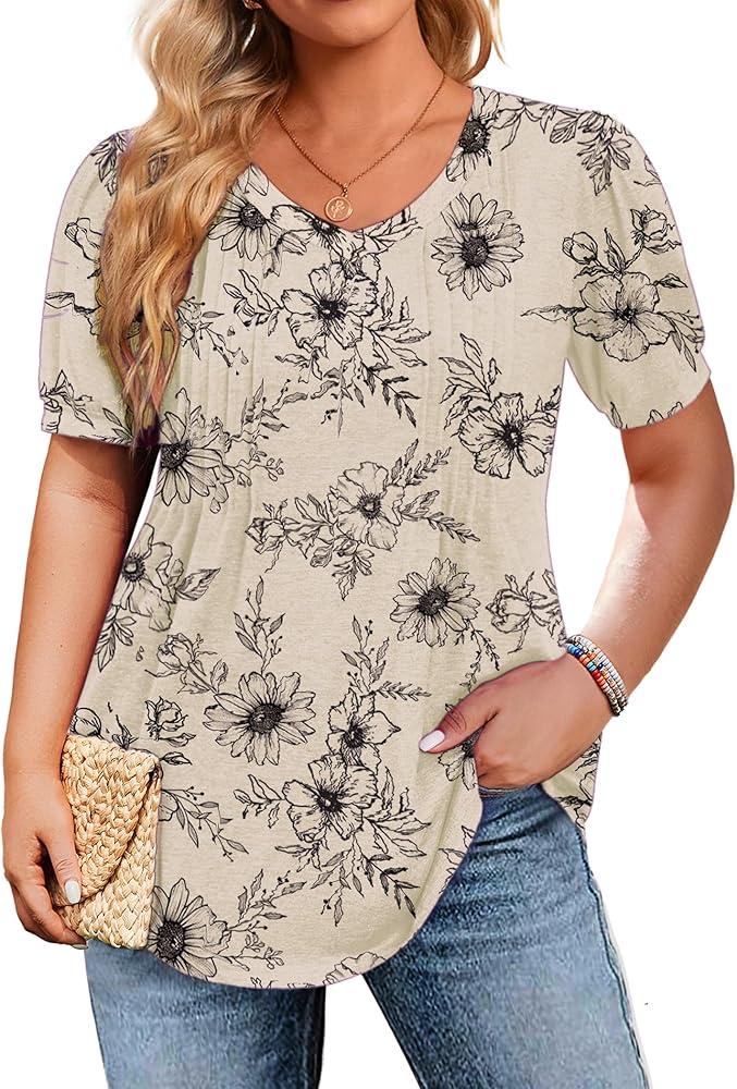 Design: Plus size tops for womens with puff short sleeve, v neck, pleated design in the front, loose fitting. Available in floral and solid colors.