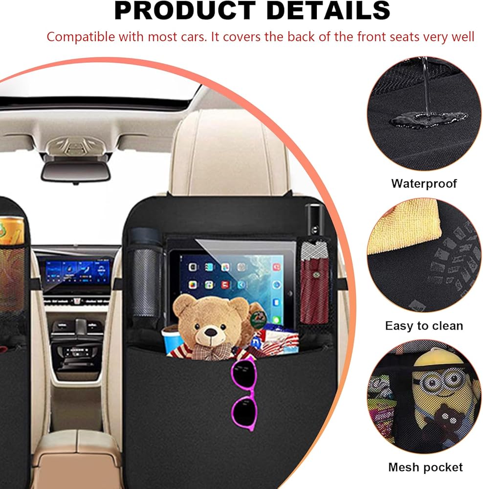 【Practical Accessory】: On the one hand, this product is used car storage bags that keep things organized. On the other hand, it is the rear seat kick mat for kids that can fully cover the front seats. It is a practical car travel accessories suitable for most vehicles.