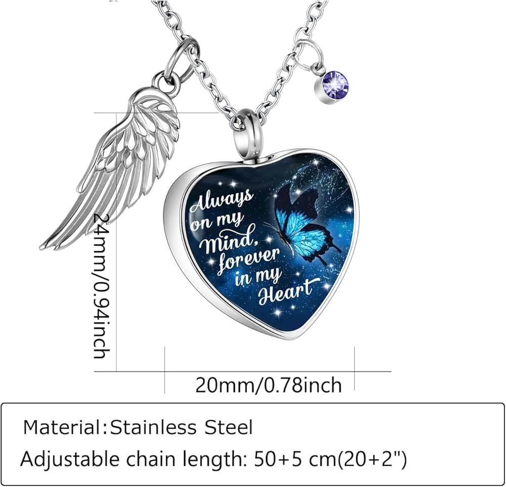• Each cremation necklace comes with birthstones and angel wings charm.Color printing "Your wings were ready but my heart was not". Comes with a funnel kit, help you put ashes in easily.