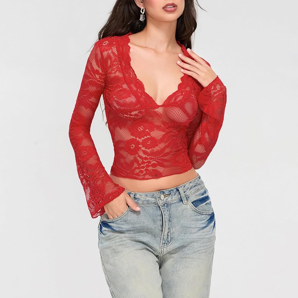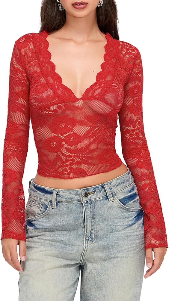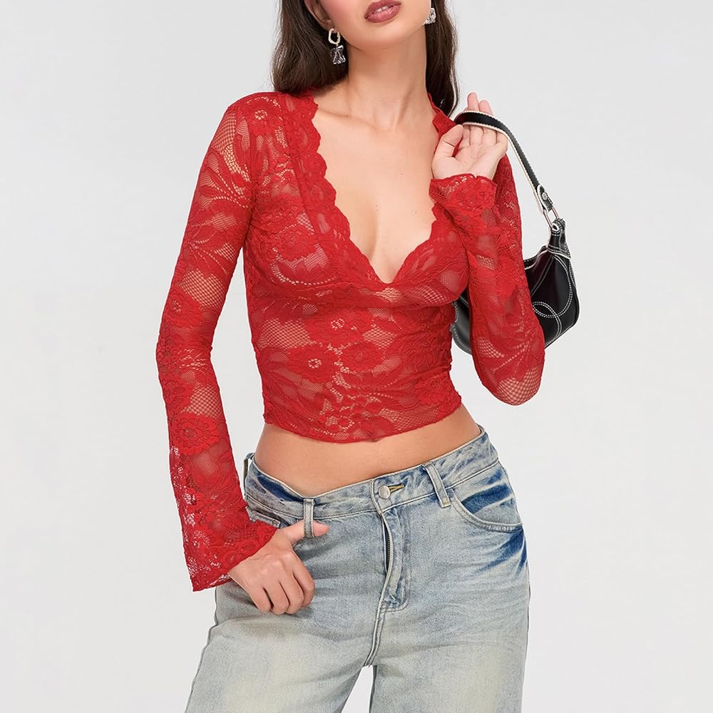 Versatile Style: Women sheer tops can be paired with jeans, skirts, or pants for a chic look, sexy tops for women, lace long sleeve tops for women, going out tops