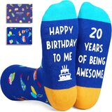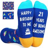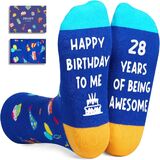 BIRTHDAY GIFTS: These socks feature birthday gifts, hats, cakes, balloons, and other elements on the top, while the bottom features a hilarious secret message written in non-slip ink: "HAPPY BIRTHDAY TO ME, 26 YEARS OF BEING AWESOME."