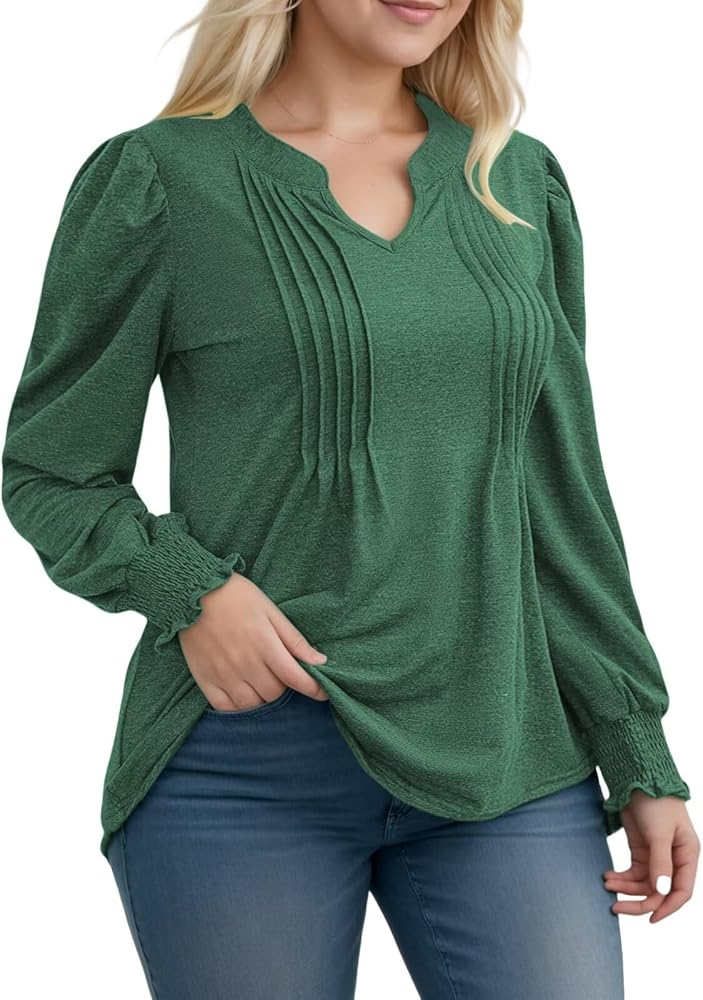 Womens cute plus size puff long sleeve shirts feature pleats decor and delicate smocked cuff that enhance its versatility for casual or dressy wear.