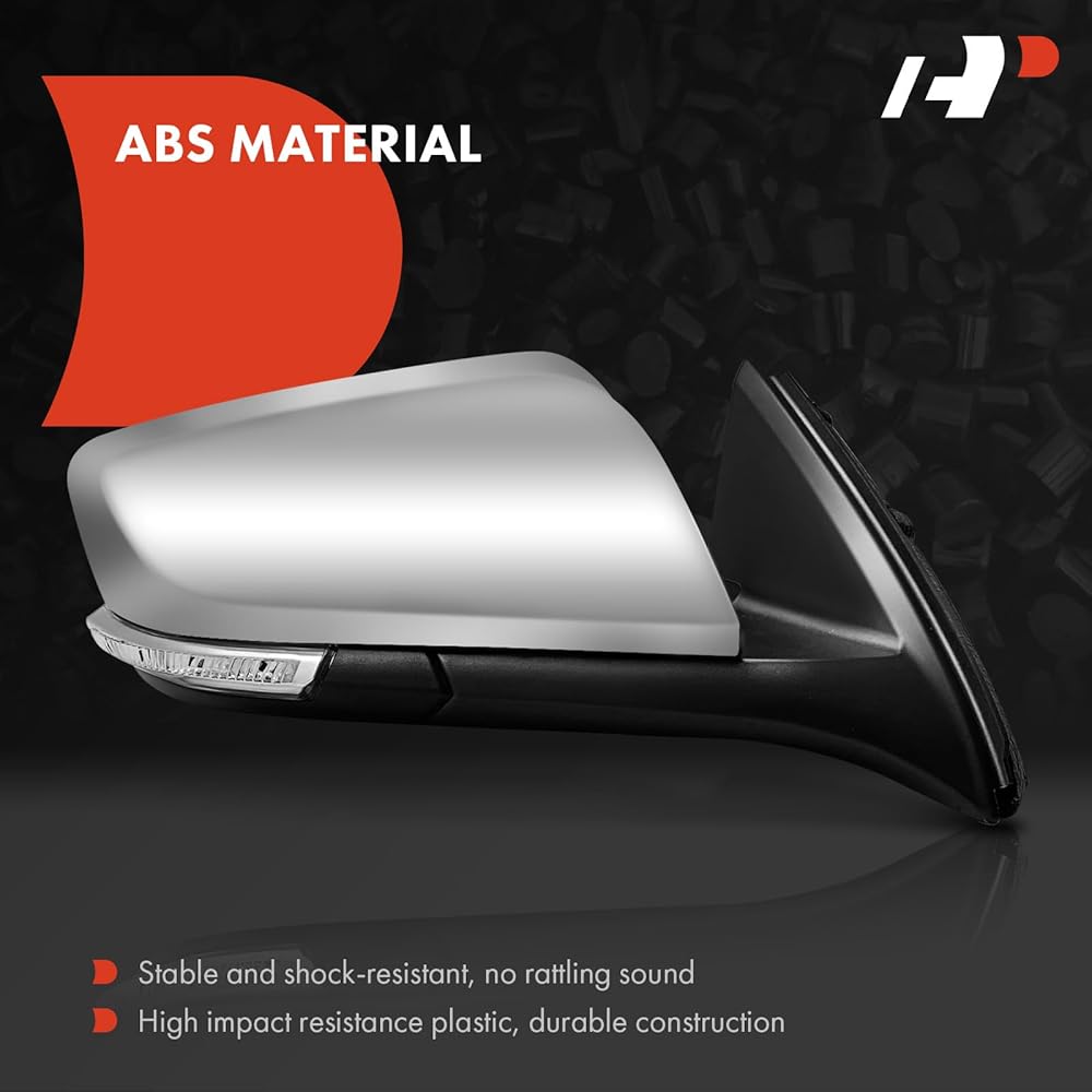 [Specifications]: ① Position: Front Left Driver Side; ② Color: Chrome; ③ Glass Type: Flat; ④ Mirror Adjustment Method: Powered; ⑤ Foldaway: Yes; ⑥ Folding Type: Manual; ⑦ Turn Signal Indicator: Yes; ⑧ Blind Spot Detection: No; ⑨ Heated: Yes (Also fits Non-Heated); ⑩ Memory Recall: Yes; ⑪ Plug Configuration: 18 hole 12 prong