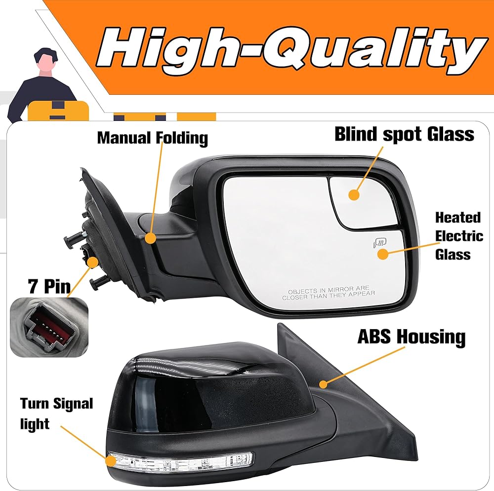 【Quality】:The product is made of ABS plastic material, which is waterproof, dustproof, sturdy and durable, with a long service life.With Blind Spot Glass Power Heated Turn signal And Puddle Light,Without Power Folding.
