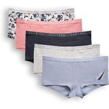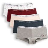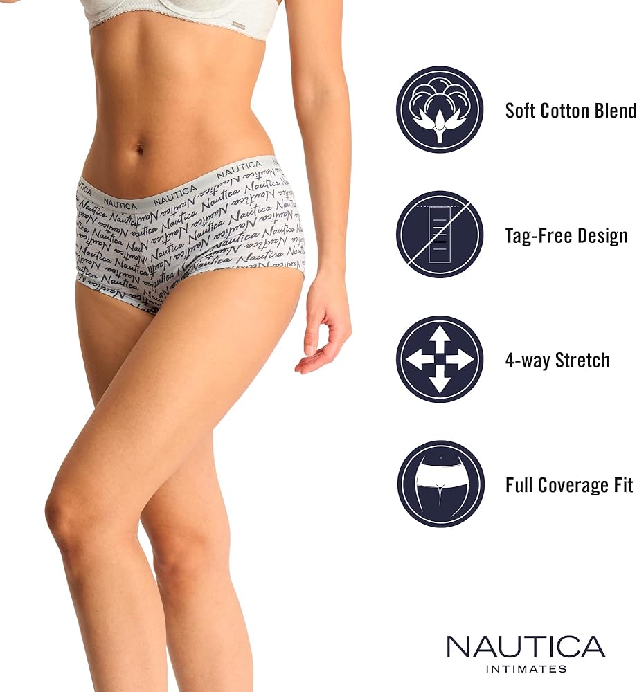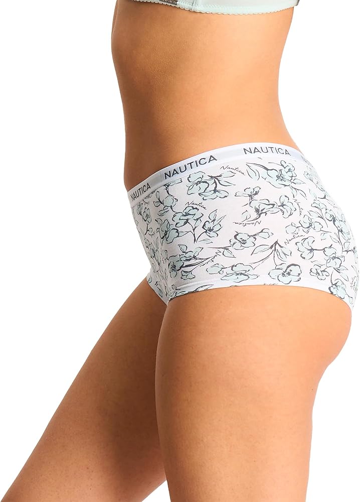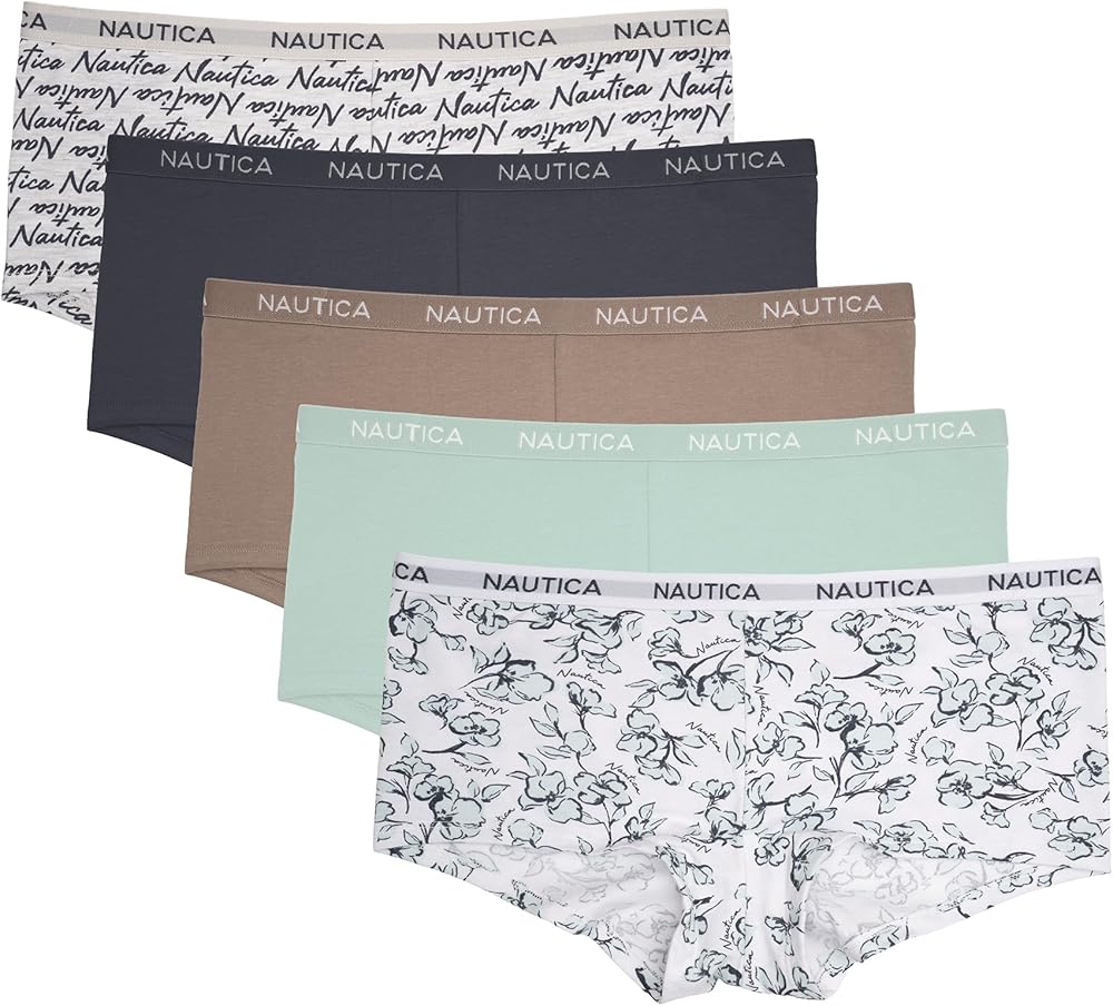 Our story began in 1983 with one clear vision: to create nautical-inspired, quality pieces that allow people across the world to realize and experience the joy of the water. Starting with only six outerwear pieces, Nautica grew into a renowned global lifestyle brand with over 35 categories in more than 65 countries. Now, as we look towards the future of Nautica, we strive to be more reflective of the rapidly changing world around us, and connect with it in new ways: through sustainability, social responsibility, and smart functional design you want to live your life in. Nautica's coordinated 5-Pack Cotton Boyshort Panty Sets are designed with you in mind. We start with soft, smooth cotton fabric and add a touch of spandex for a move-with-you fit while maintaining breathability. Next, we choose a variety of brand-forward colors and prints we are confident you will love. Finally, we updated our underwear with a tag-free design, so you never have to worry about scratching or adjusting throughout the day. Finished with a stretchy branded waistband for a classic, high quality touch and a stay-in-place design. Experience the timeless look and quality of Nautica today.