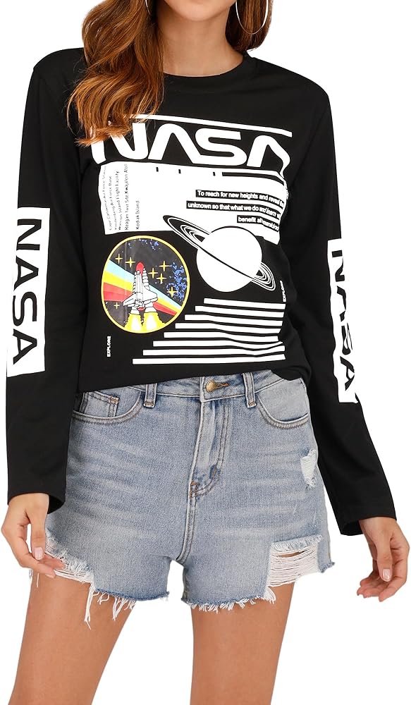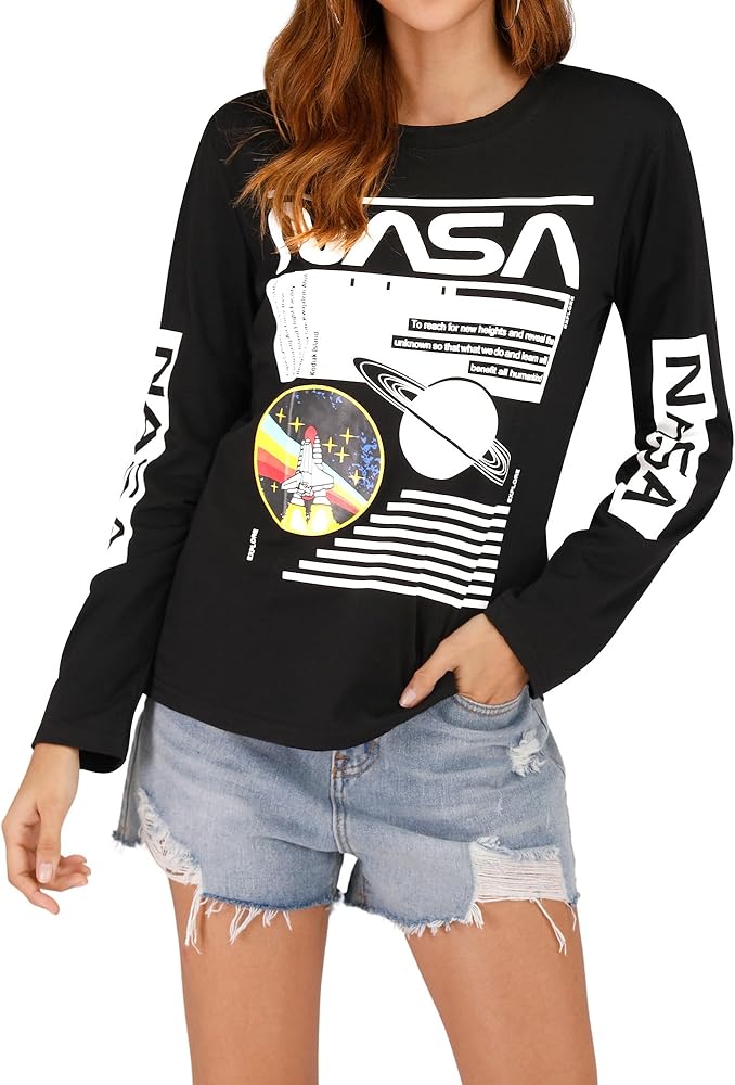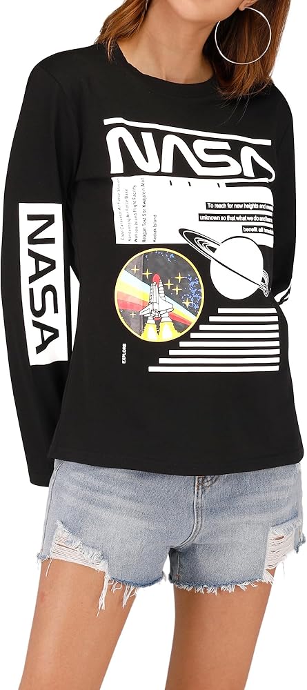 【CUTE RETRO VINTAGE SPACE SHUTTLE TEES】Classic Nasa Space Graphic Print, Fashion Element Logo Letter Print, Wear This Special Shirt Catch The Popular Steps! Cute Long Sleeve Shirts For Teen Girls! Space Shirt, Nasa T Shirt Perfect To Wear With Nasa Hat, Nasa Backpack And Nasa Jacket. Birthday Gift Idea For Kids Who Love Astronauts And Space, Area 51 Or Alien, Space Force, Galaxy, Universe.