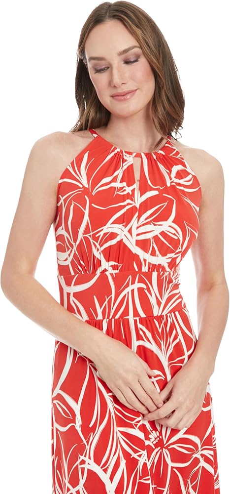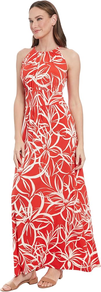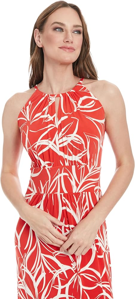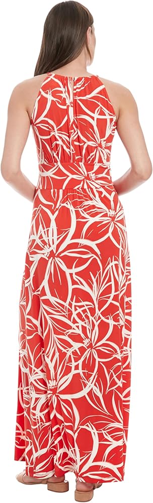 This sleeveless maxi dress features a jewel halter neck with keyhole openings, a contrast border printed waistband, and a flowing skirt with soft gathering for an ethereal silhouette, perfect as a summer dress, cocktail dress, or wedding guest dress.