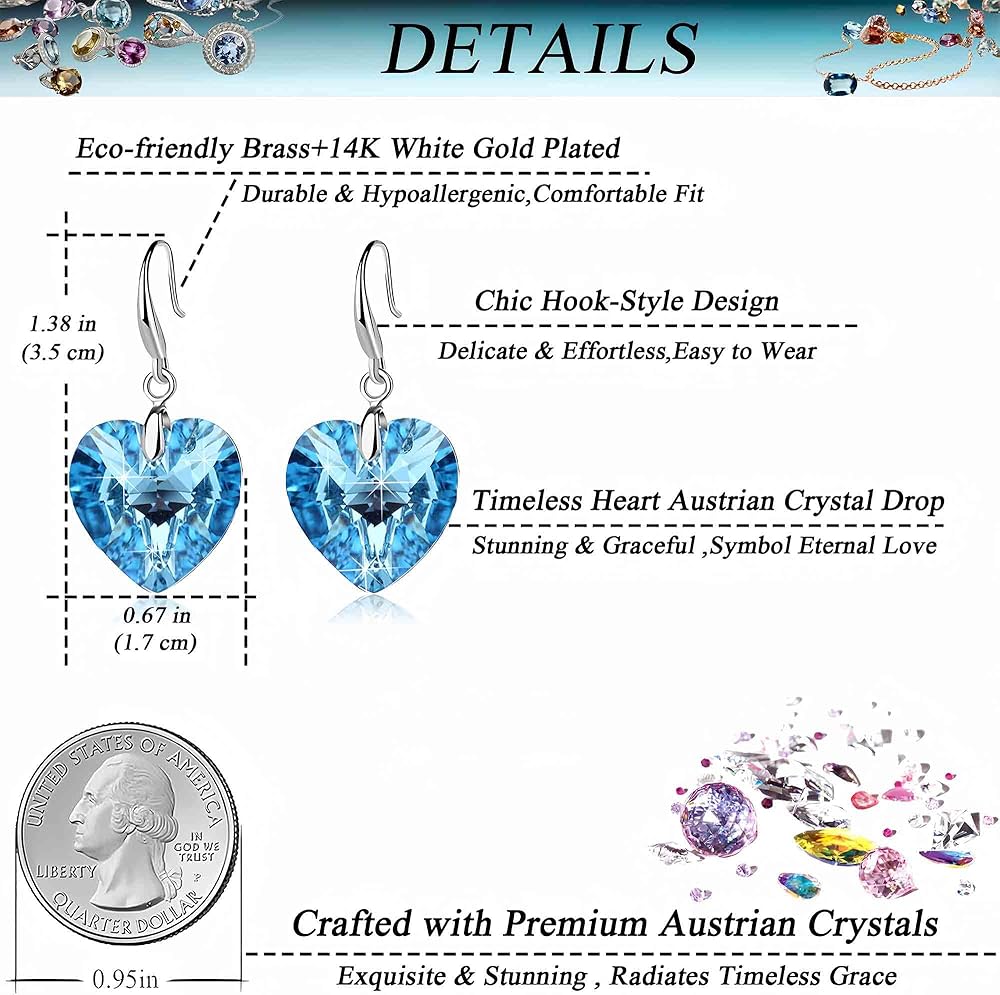 【Bling & Allergy-Safe】 — Elevate your look with our stunning Heart-Shaped Austrian Crystal Drop Earrings. Featuring brilliant Austrian crystals that sparkle with every movement, These earrings are crafted from durable copper with luxurious 14K white gold plating hypoallergenic hooks, Perfect for sensitive ears. Enjoy safety and comfort while shining with confidence all day long.