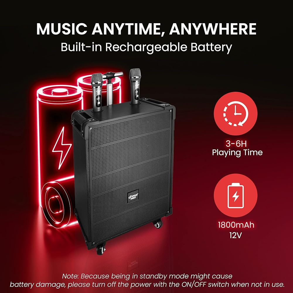 SPEAKER BATTERY QUALITIES: With a battery type of 12V/4.0AH Lead Acid Battery it allows you to use the speaker up to 3+ Hours. Built-in Rechargeable Battery by 12V/4.0AH and battery operated microphone that requires (2) x ‘AA' batteries each