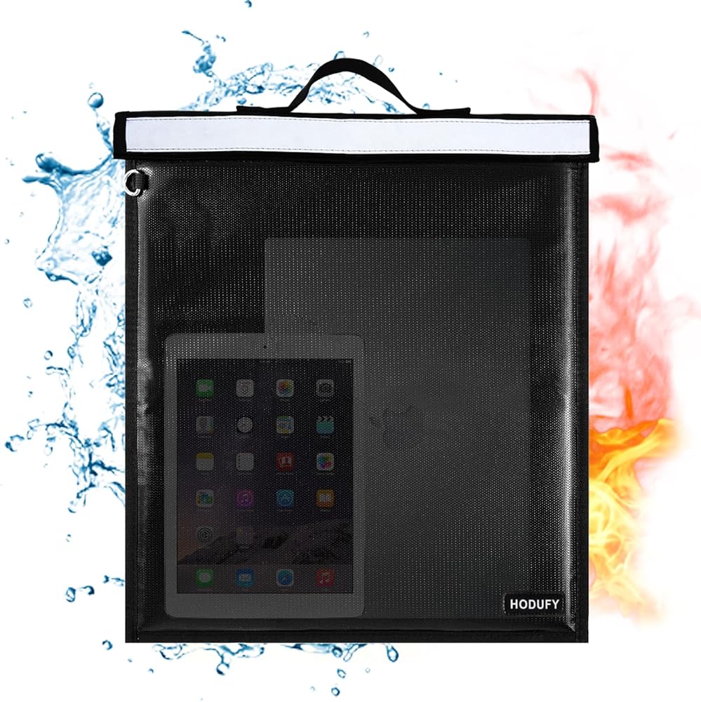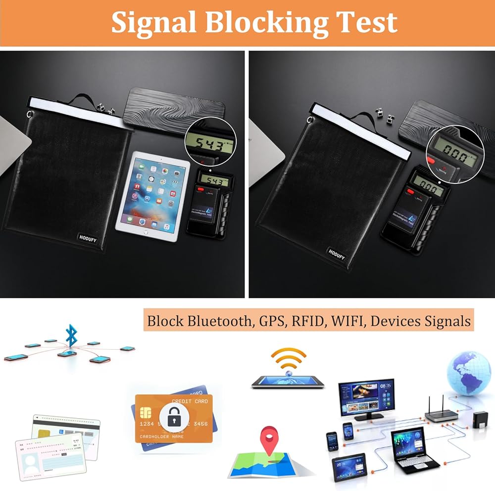 SUPER MULTIFUNCTIONAL PROTECTION FARARAY CAGE - Hodufy Tablet Faraday bag consists of a double layer super shielded metal fiber which 100% blocking all types of signals: WiFi, Bluetooth, RFID, GPS, cell phone jammers, including 5G networks, AirTag, car key, SMS, NFC and radio signals. large faraday key fob protector are made of fiberglass cloth that has been coated with a high-tech non-itch silicone that is not only fireproof but also water resistant. Our faraday bags key fob keep your cash, phone, documents, laptop and other property your valuable 100% safe in the event of a fire or a rainy day.