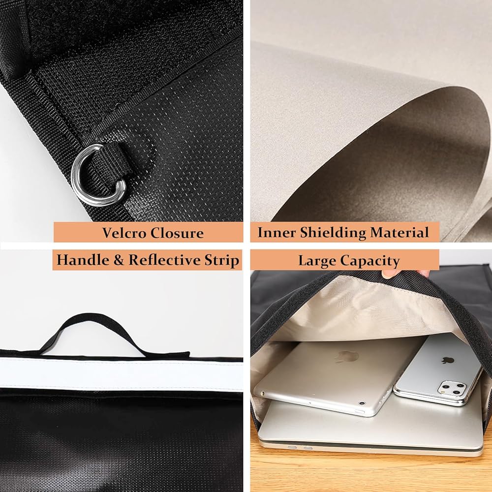 FARADAY BAG WITH HANDLE - No longer have to worry about meetings being disrupted or bugged. Faraday bag for laptop is constructed with Top high-quality non-itchy silicone coated fiberglass and super shielding metallic fiber. Our faraday cage key fob block all radio signals ranging from Wi-Fi and Bluetooth to RFID and GPS. faraday bag for phones can be simply folded to store in the faraday box, car key signal blocker box, signal blocking box or be taken to any places you want