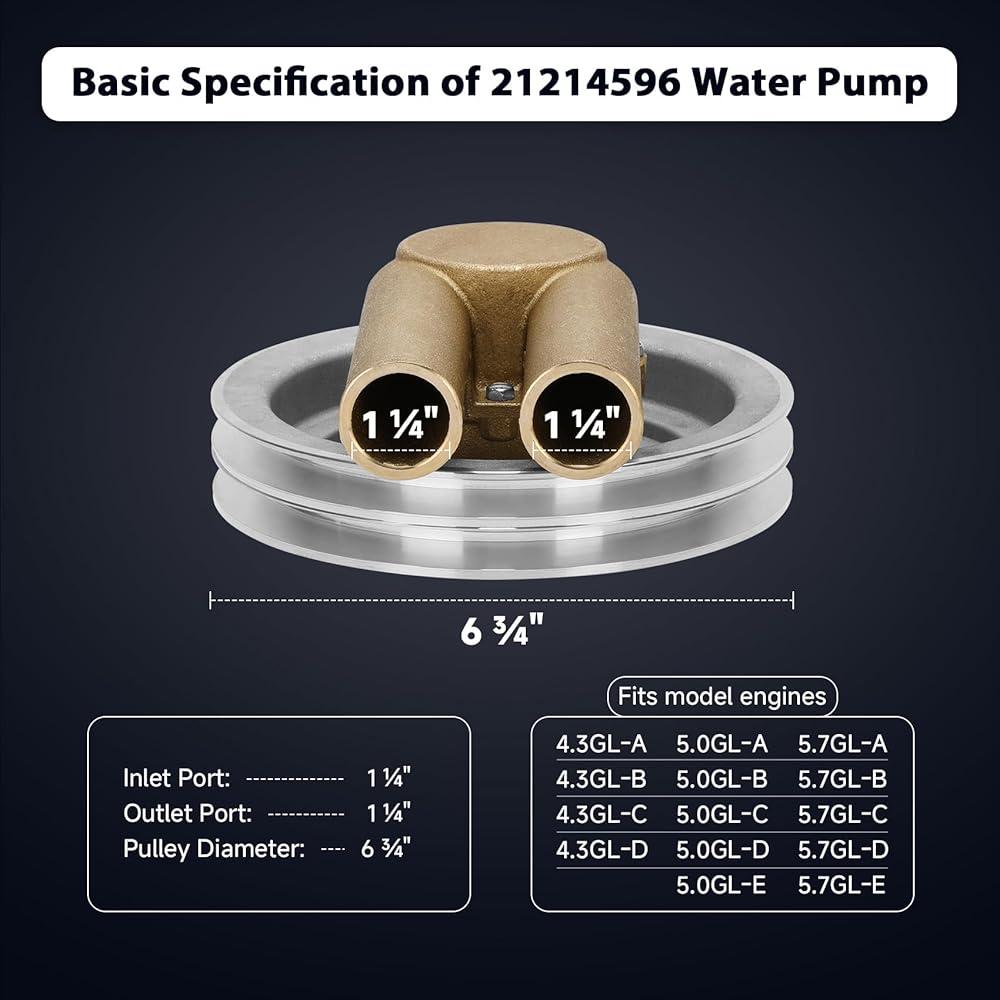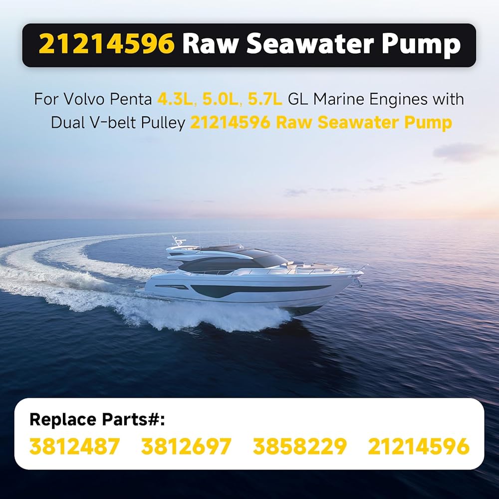 【Long-Lasting】:21214596 water pump has been tested for its performance before shipment. Crankshaft driven water pump designed to fits for Volvo Penta 4.3L, 5.0L, and 5.7L GL marine engines with dual v-belt pulley. (No core required). 21214596 water pump designed for long-lasting that save you lot of efforts on maintaining your water pump