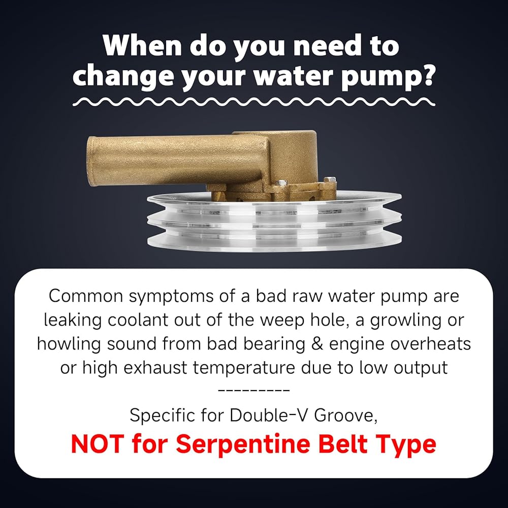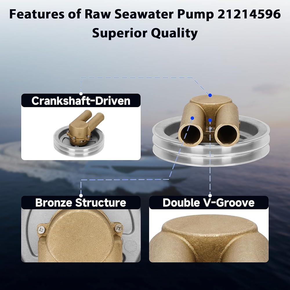 【Unique Design】:Combined with pulley, male pilot, inlet port, outlet port, the 21214596 water pump is able to serve your engine with no issues. Bronze raw water pump with v-belt pulley bring the efficiency of 21214596 sea water pump to the next level