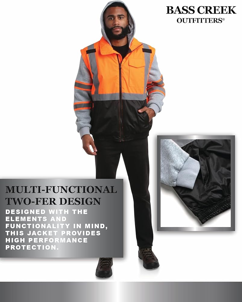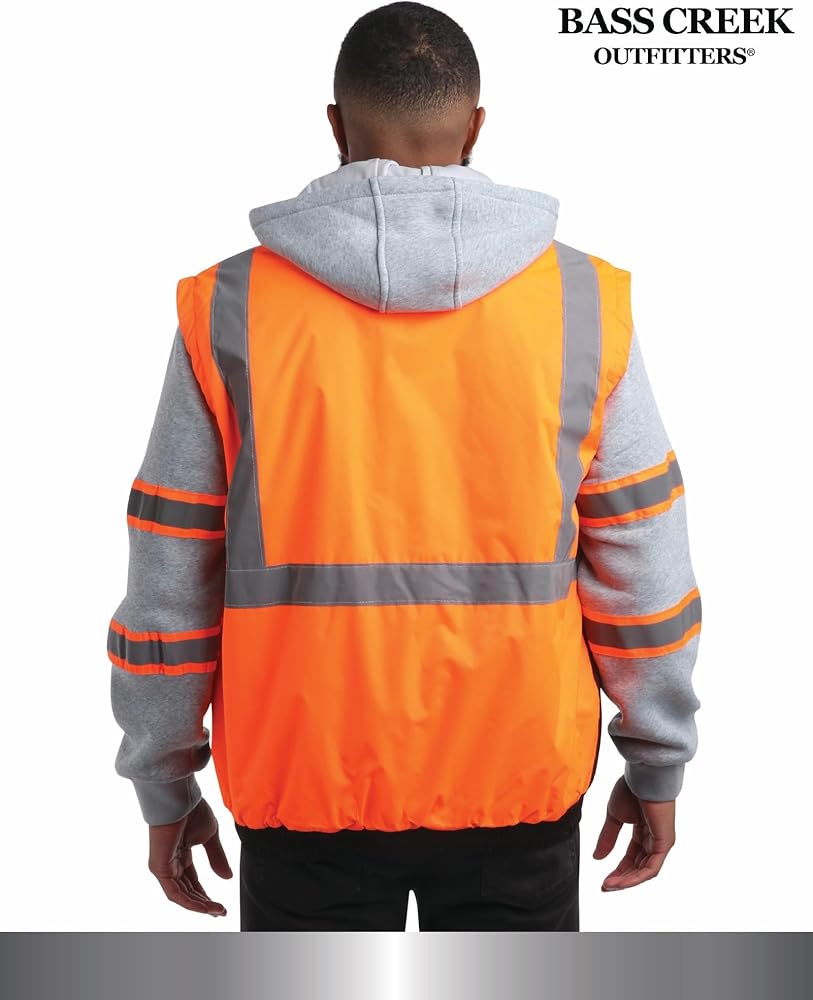 AUTHENTIC BASS CREEK OUTFITTERS: Men's Workwear Full Zip Insulated Hooded Two-Fer Vest with Quilted Lining, Fleece Sleeves and Hood; Warm, Durable, Authentic Outdoor Gear