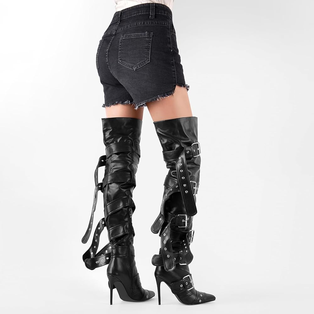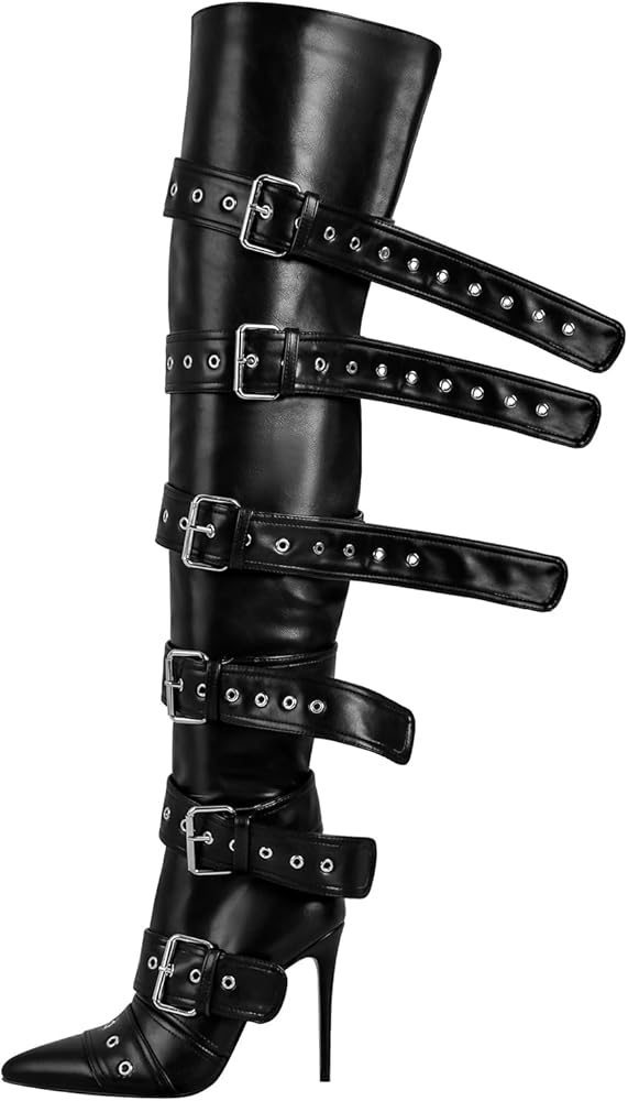 Design: Multi-buckle adjustable thigh-high boots with side zipper and thin high heel design.Our shoes are handmade, each pair is carefully designed, and we provide the factory with a high quality working environment to ensure the quality of each pair of shoes.