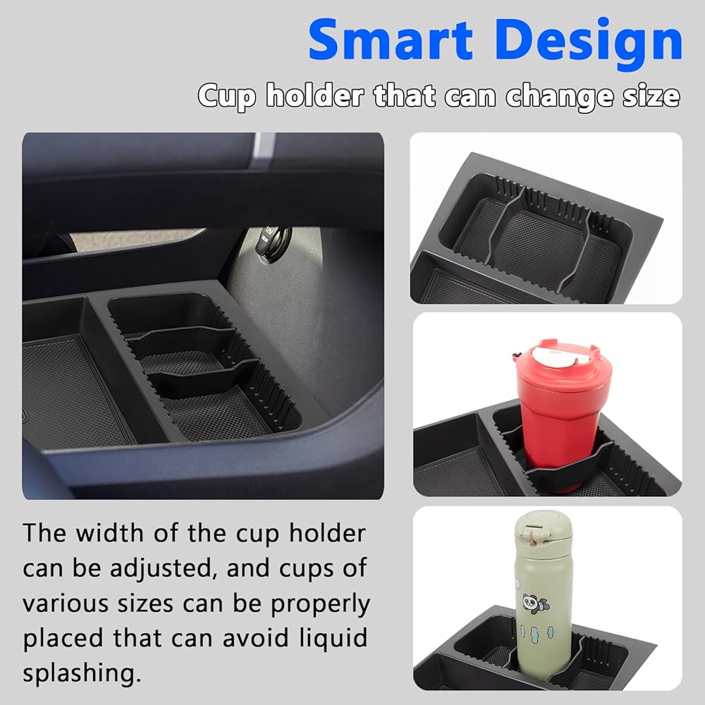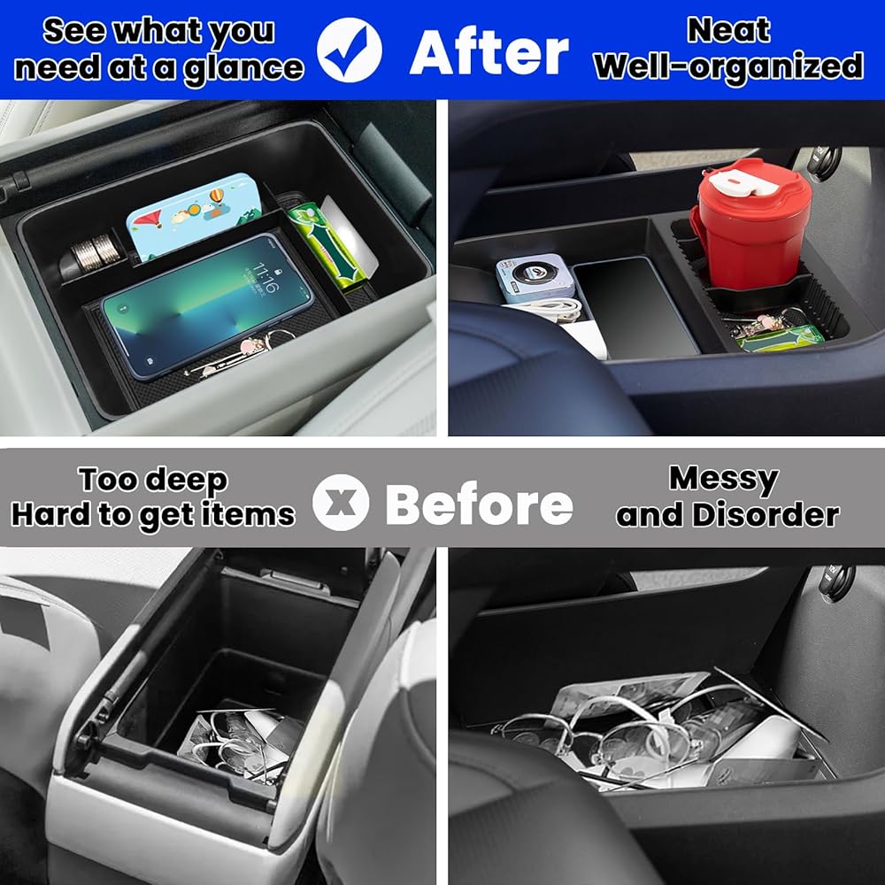 Keep Organized: We help you sort the center console into categories; the tray also have adjustable cup holders that can hold your cups of different sizes; there is a hole in the center console tray so it will not affect the charging of the phone