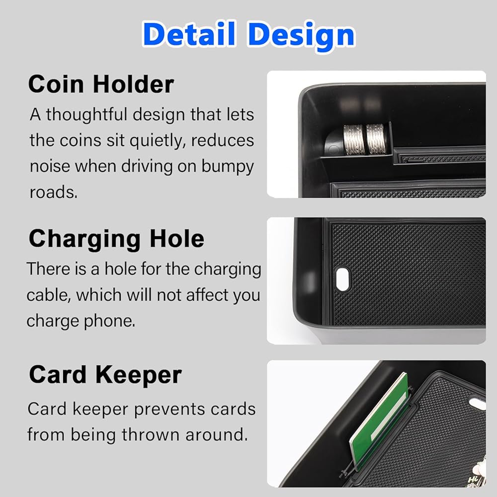 Elaborate Design: We designed a hole for your armrest tray that will not block the armrest light; And it won't take up too much of your center console so you can put the items you use most above the tray and the ones you don't use most below the tray