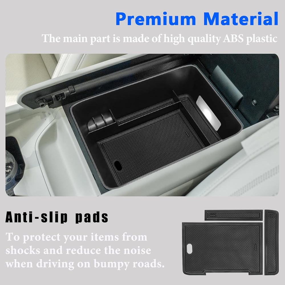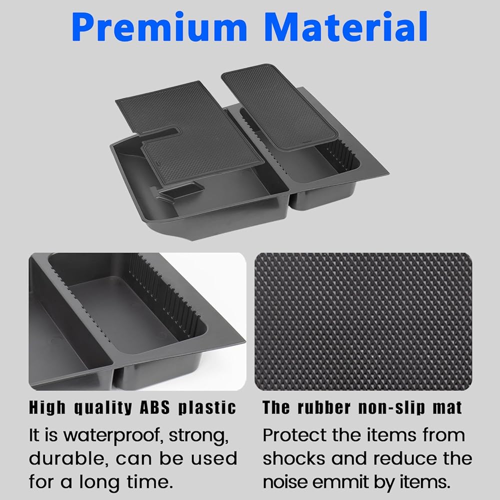 Premium Materials: Console organizer is organized with premium-quality ABS material; it comes with black rubber pads that increase friction and reduce the sound of objects colliding when the vehicle is moving