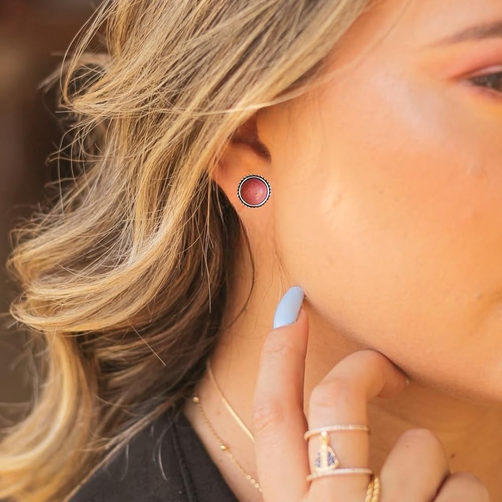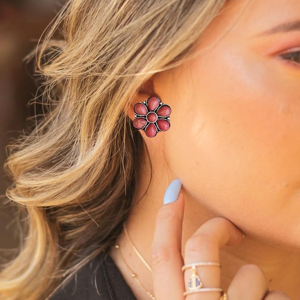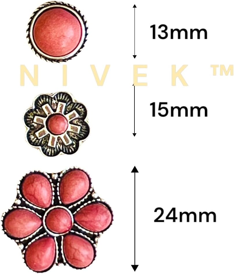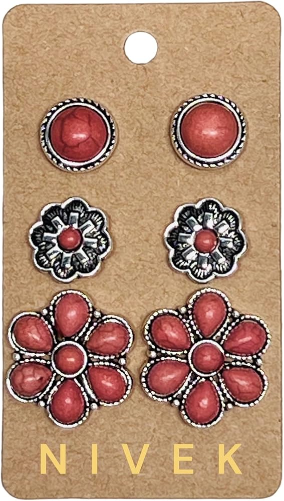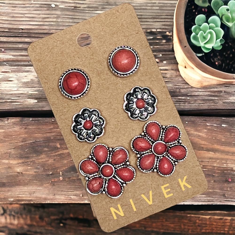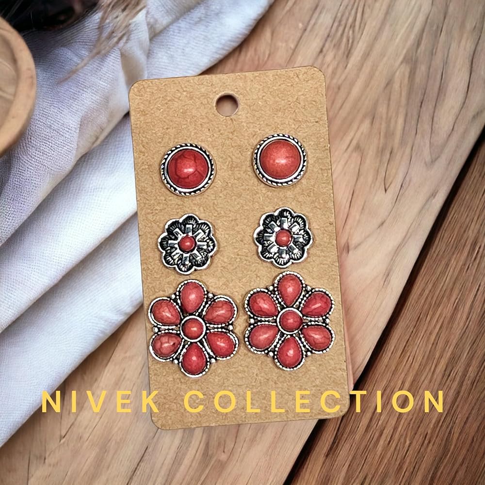 NIVEK Set of 3 Turquoise Stud Earrings – Western Boho Southwestern Flower Round Bohemian Silver Antique Finish Statement Jewelry