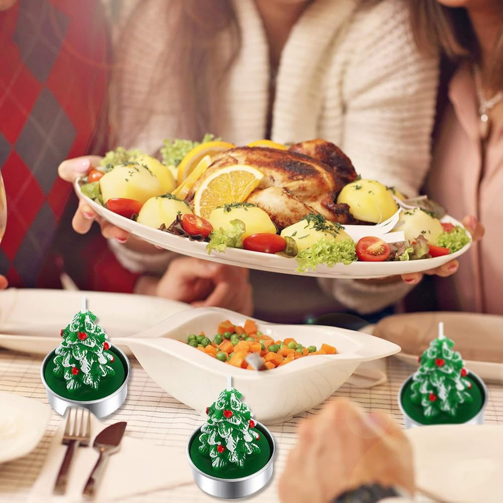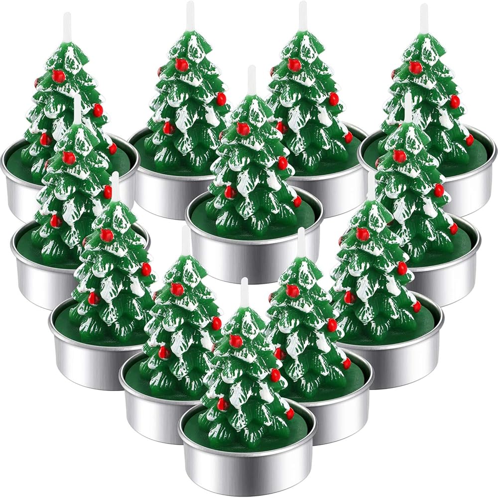 Vivid plant decoration: 12 pieces of lifelike Christmas tree shape, cute decorative candles in metal tealight holders; Good for home decor, Christmas ornament, festival, party favor, etc.