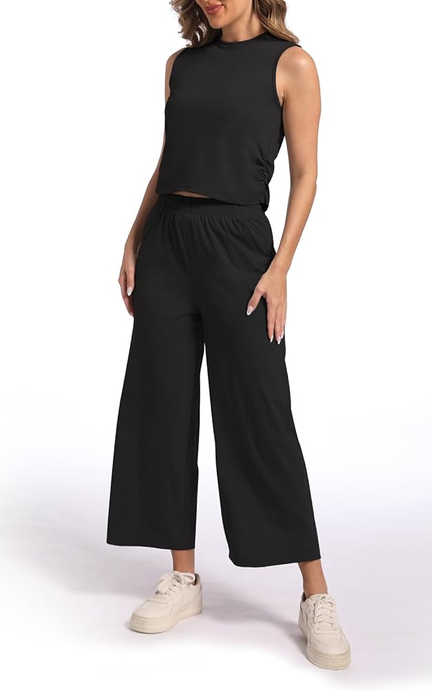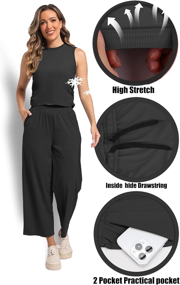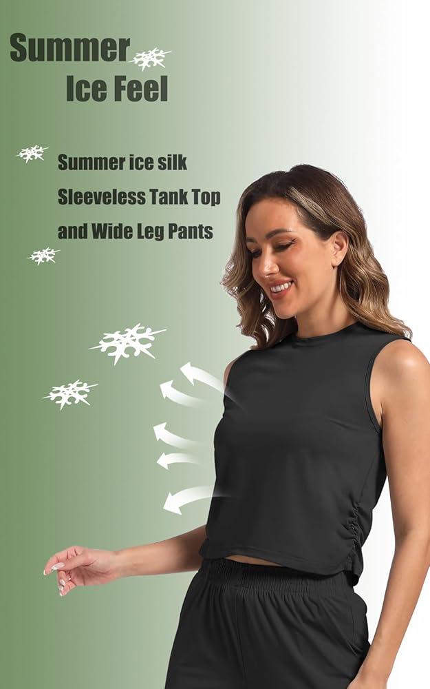 This two piece women's outfit set sleeveless Ice Silk top and Wide Leg pants. The soft, stretchy fabric made from a blend of 75% nylon and 25% spandex provides comfort and flexibility. Perfect for casual wear, this outfit can be dressed up or down for a variety of occasions like weekends, travel, and holidays. The loose, pull-on style top has a solid pattern and the elastic waistband pants offer a comfortable, loose fit. Hand wash only for easy care. Designed for women, this flattering two piece set makes a great addition to any wardrobe.