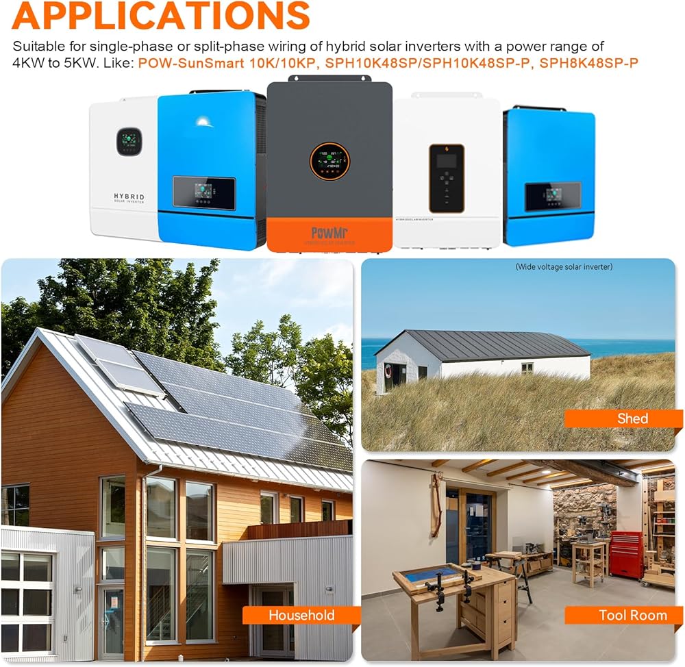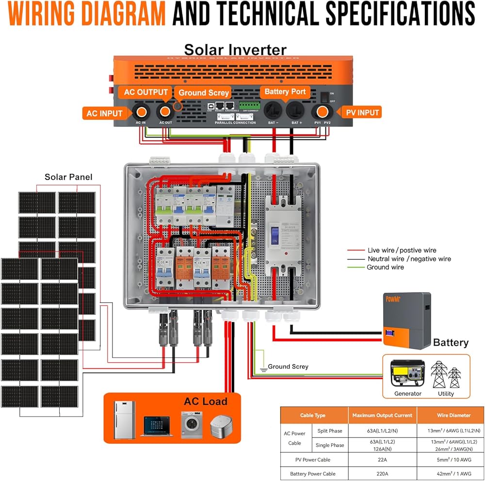 【High-Quality Configuration】Equipped with a 2P-250A battery power circuit breaker(Suggested size for battery wire Lugs: M8), a 2P-25A photovoltaic input circuit breaker, and a 2P-63A,1P-125A AC input/output circuit breaker, this PV distribution box also features built-in DC and AC surge protection to effectively prevent lightning strikes and ensure the safety of solar energy systems. The PV input terminal comes with built-in solar connectors for simple connection to the photovoltaic array, offering plug-and-play functionality.【Designed for POW SunSmart 10K /10KP solar inverters】