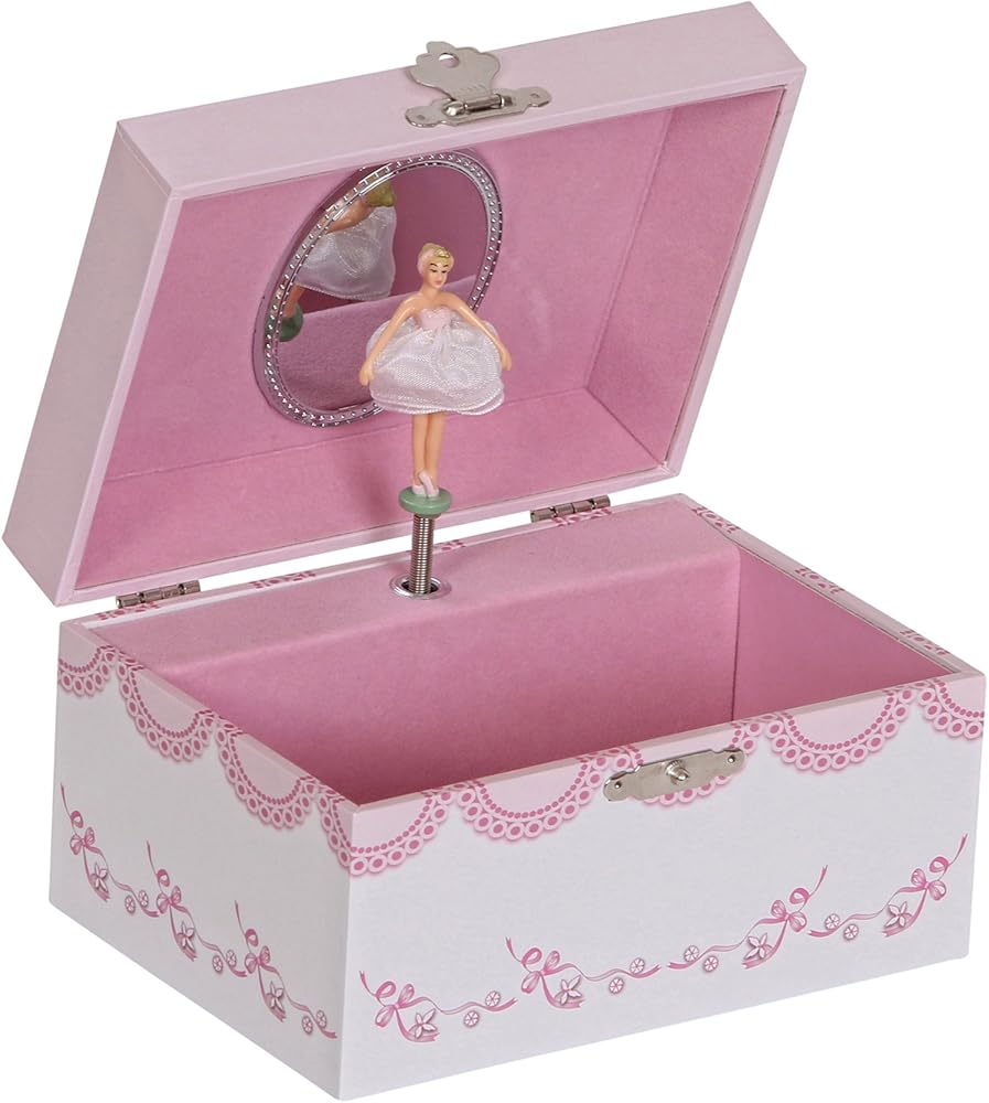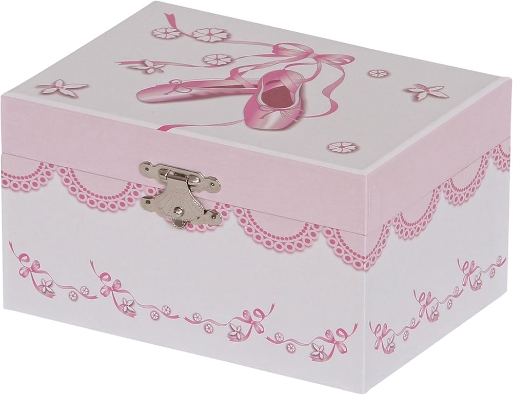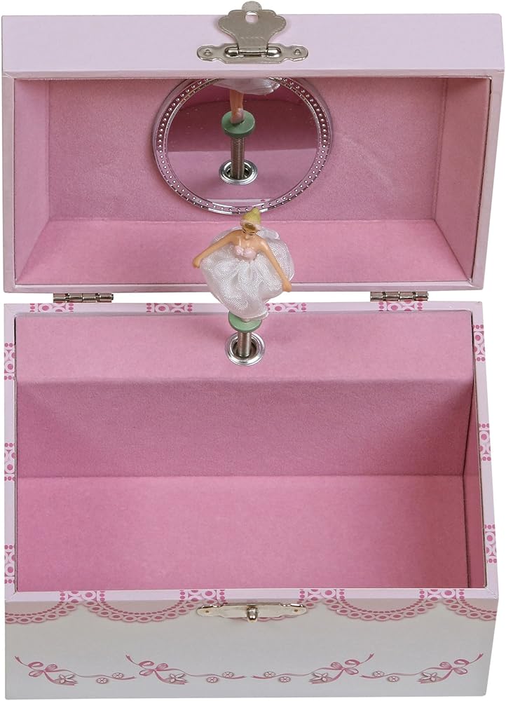 Fun and fanciful, the Mele & Co. Cora girl's musical ballerina jewelry box will enchant and delight young and old alike. With a twirling ballerina and pretty accents, this jewelry box is every little girl's dream. Decorated paper girl's musical ballerina jewelry box. Ballet slipper and ribbon fashion paper overlay. Lift lid with oval interior mirror. Twirling brunette ballerina with yellow tulle skirt. Plays "Waltz of the Flowers". Single compartment offers open area storage. Hand lined in pink sueded fabric. Silver tone latch and hardware. 5 7/8" x 4 1/4" x 3 1/4". Small parts, choke hazard, only appropriate for children 6+. Made in China.