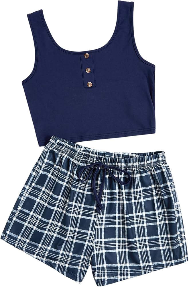 SOLY HUX Women's Pajama Sets 2 Piece Lounge Sets Button Tank Top and Plaid Shorts Sleepwear