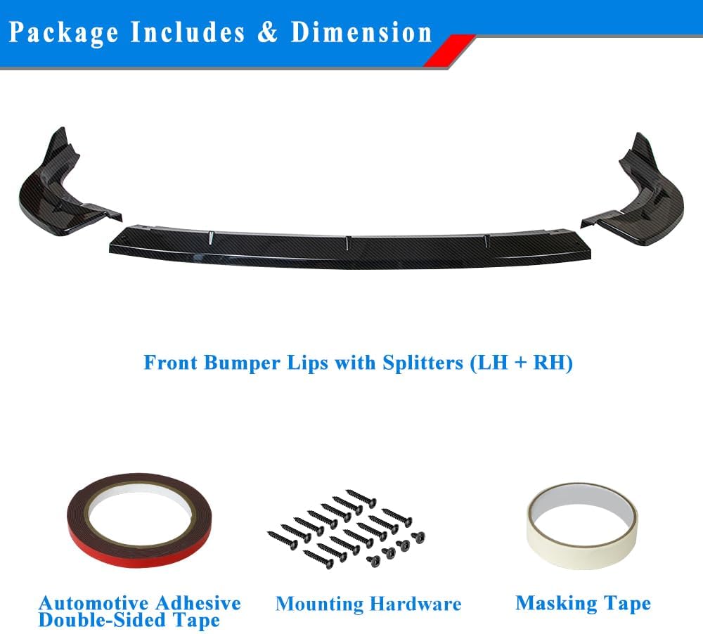 Package Includes: Front Bumper Lip x 1 set (3 pieces), Double-Sided Adhesive Tape x 1 piece, Masking Tape x 1 piece, Mounting Screw x 1 pack
