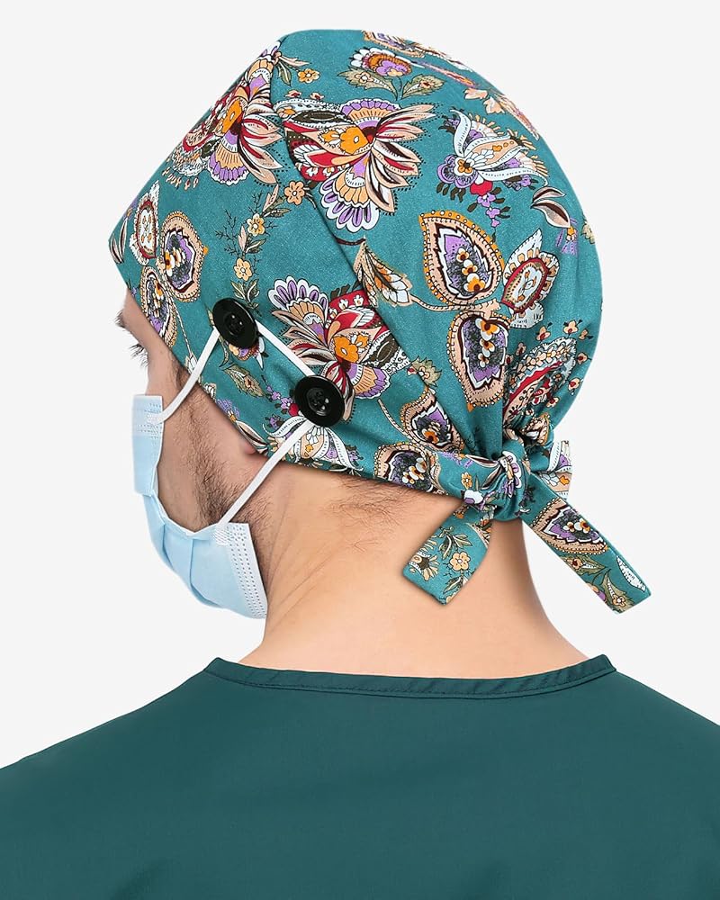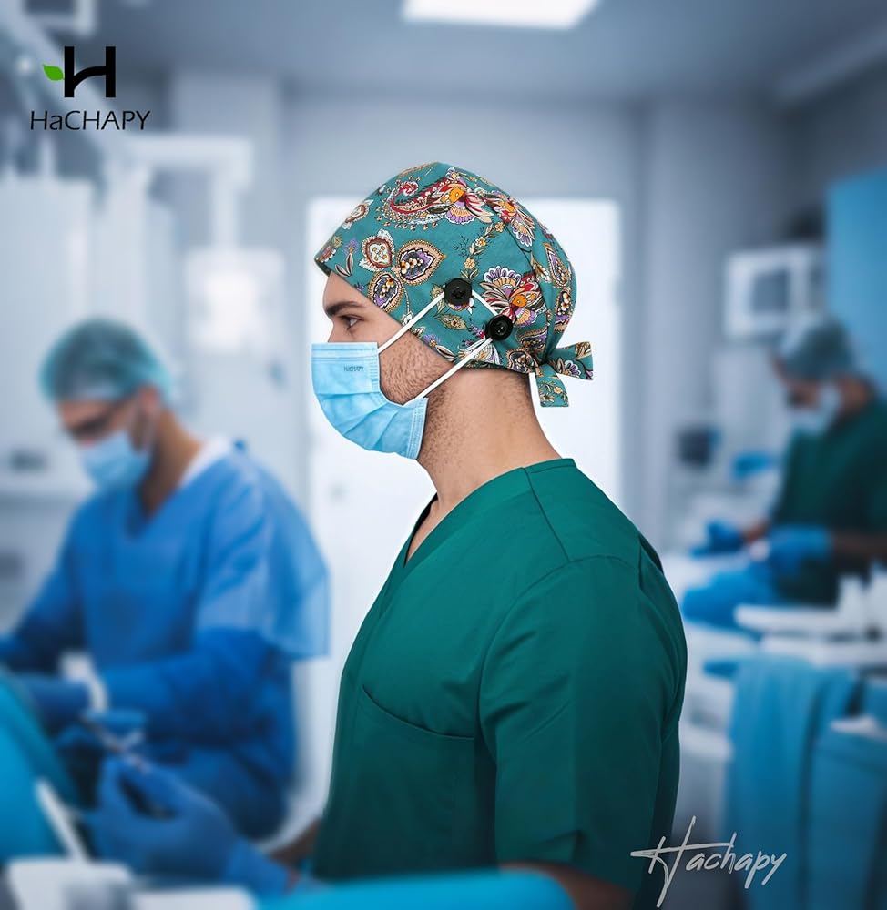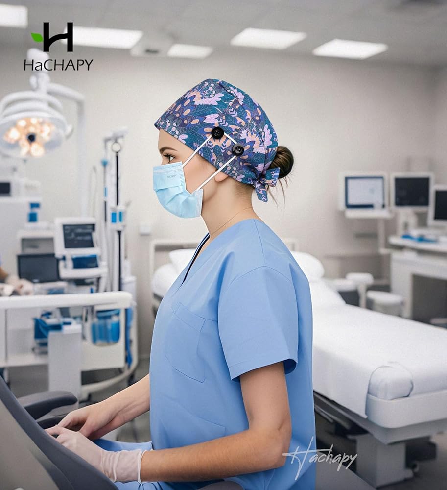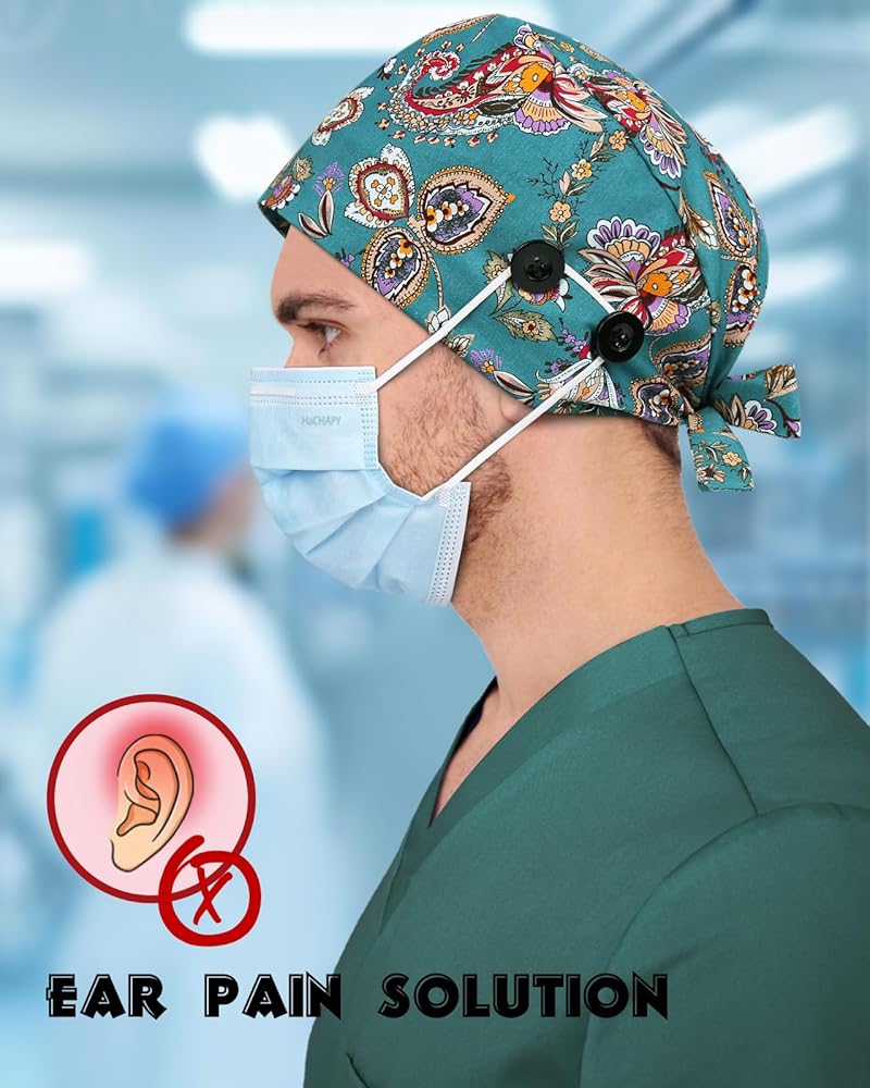 【Relief from Ear Pain with 4 Buttons】: Experience relief from ear pain caused by wearing masks all day. Hachapy Scrub Caps features four buttons strategically positioned to securely hold your mask, reducing pressure on your ears and ensuring comfort throughout your shift