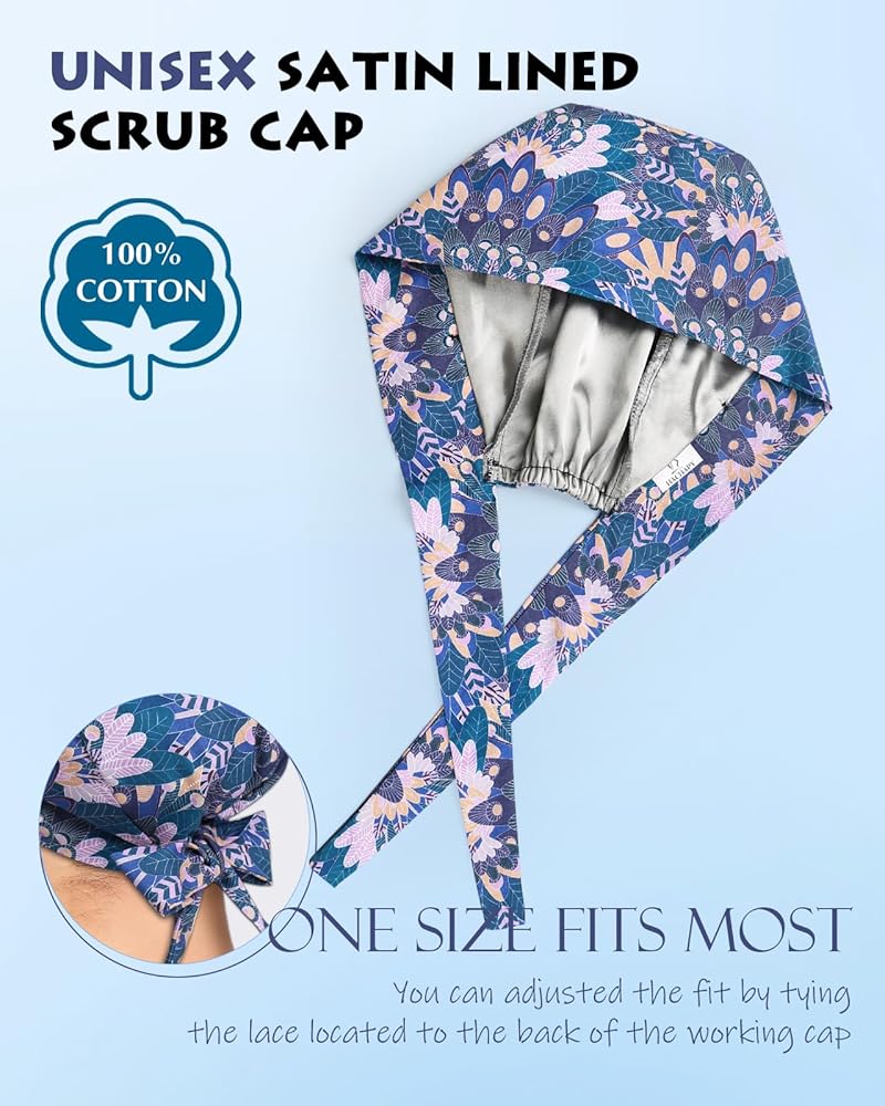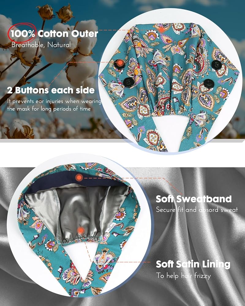 【Enhanced Protection with 2 Layers】: Crafted with two layers, Hachapy satin lined scrub cap offers superior protection. The outer layer, made of 100% cotton, provides durability and breathability, while the inner satin lining keeps your hair smooth and shielded