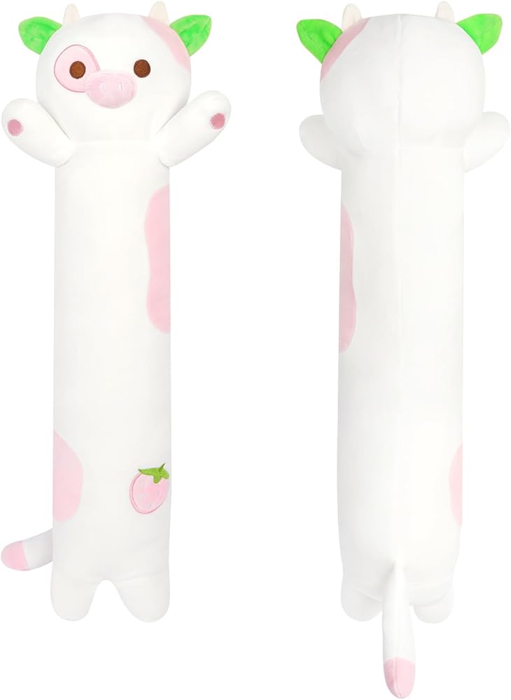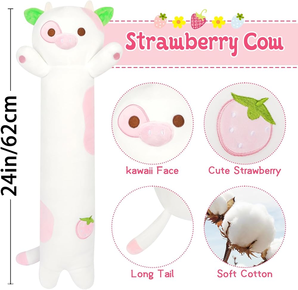 🍓𝐒𝐮𝐩𝐞𝐫 𝐒𝐨𝐟𝐭 𝐂𝐨𝐰 𝐁𝐨𝐝𝐲 𝐏𝐢𝐥𝐥𝐨𝐰:The widely used long cow plush pillow can be used as a lumbar pillow,a hug pillow,and a soothing pillow.Soft touch can soothe the baby's emotions and support the waist and back of those who work for a long time.You will like the strawberry cow stuffed animals