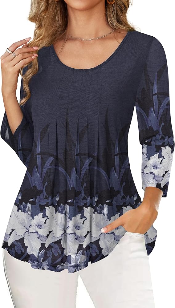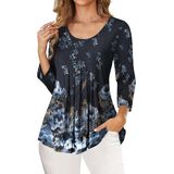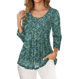 Roung neck with cute band collar detail, 3/4 sleeve, pleated front, rounded hemline