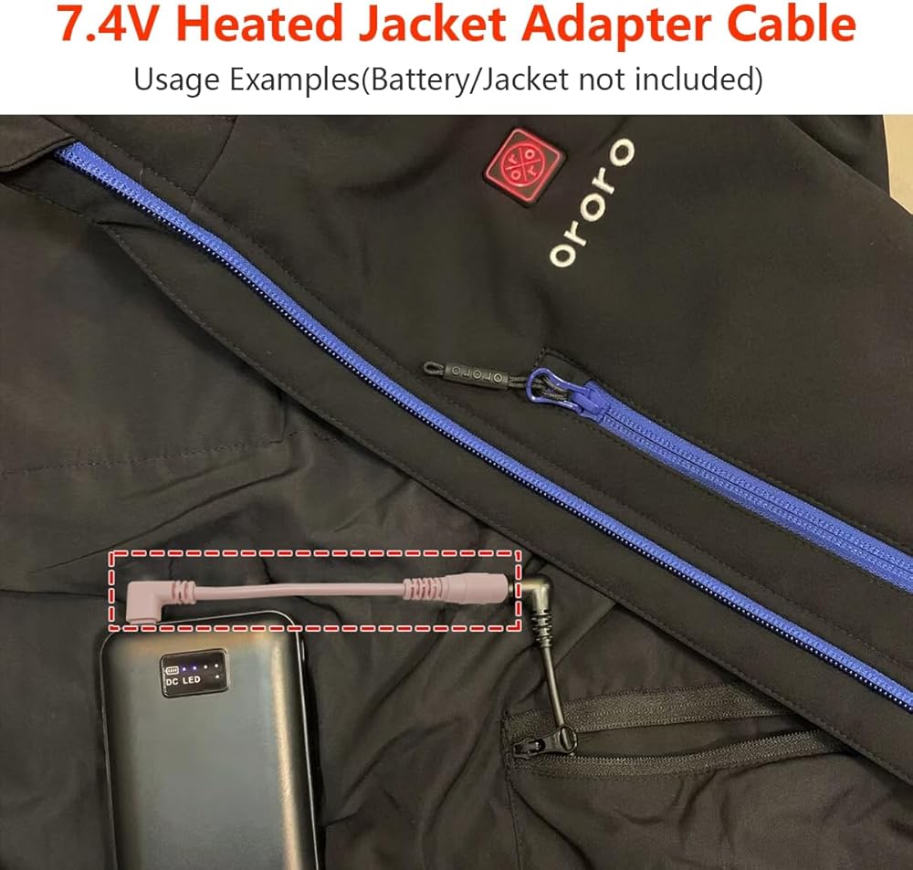 Heated Jacket Battery Charger Adapter Cable work for ORORO Heated Jacket. This Cable DC connector size is 4.0mm. If your jacket connector size is 3.5mm, 3.8mm or 5.5mm, it cannot plug into your heated jacket connector with this cable. Please attention this before purchase!